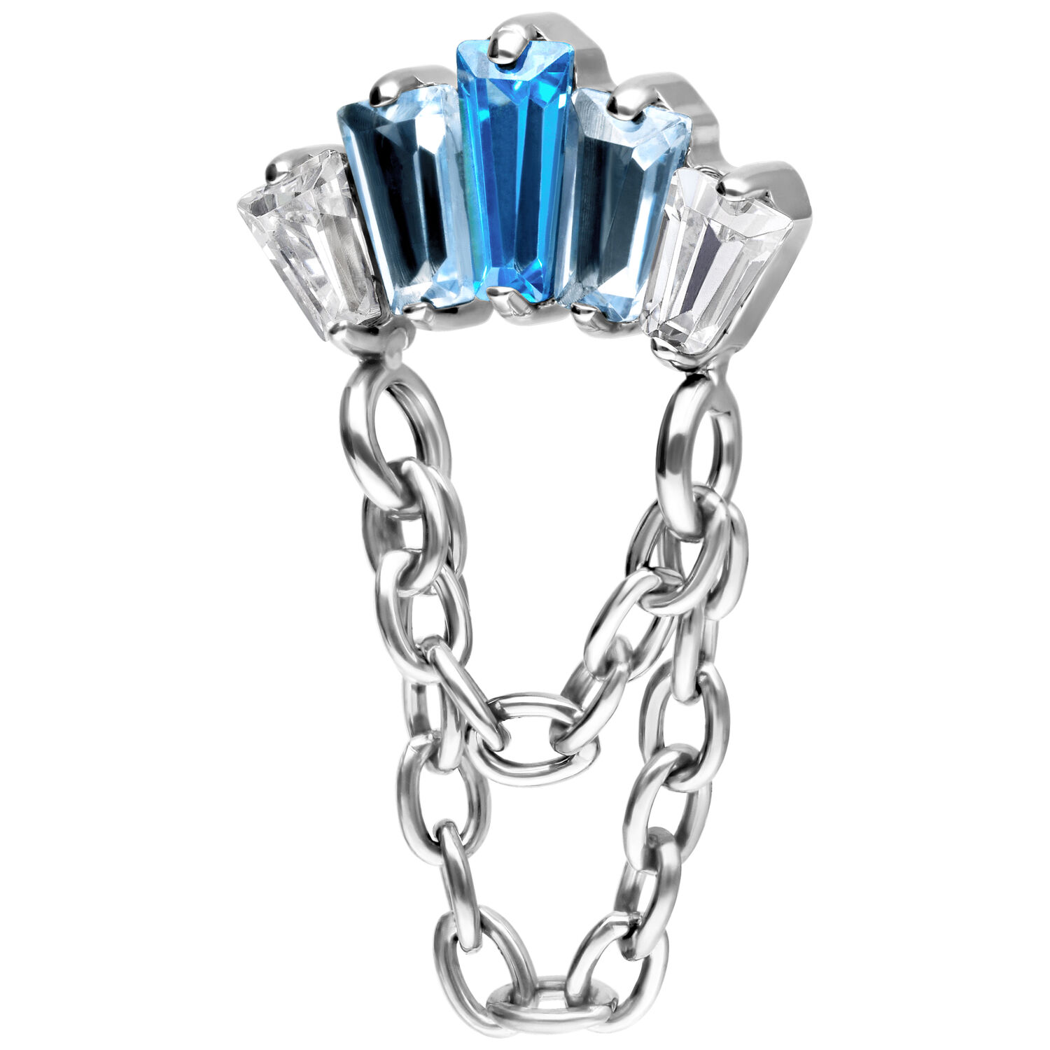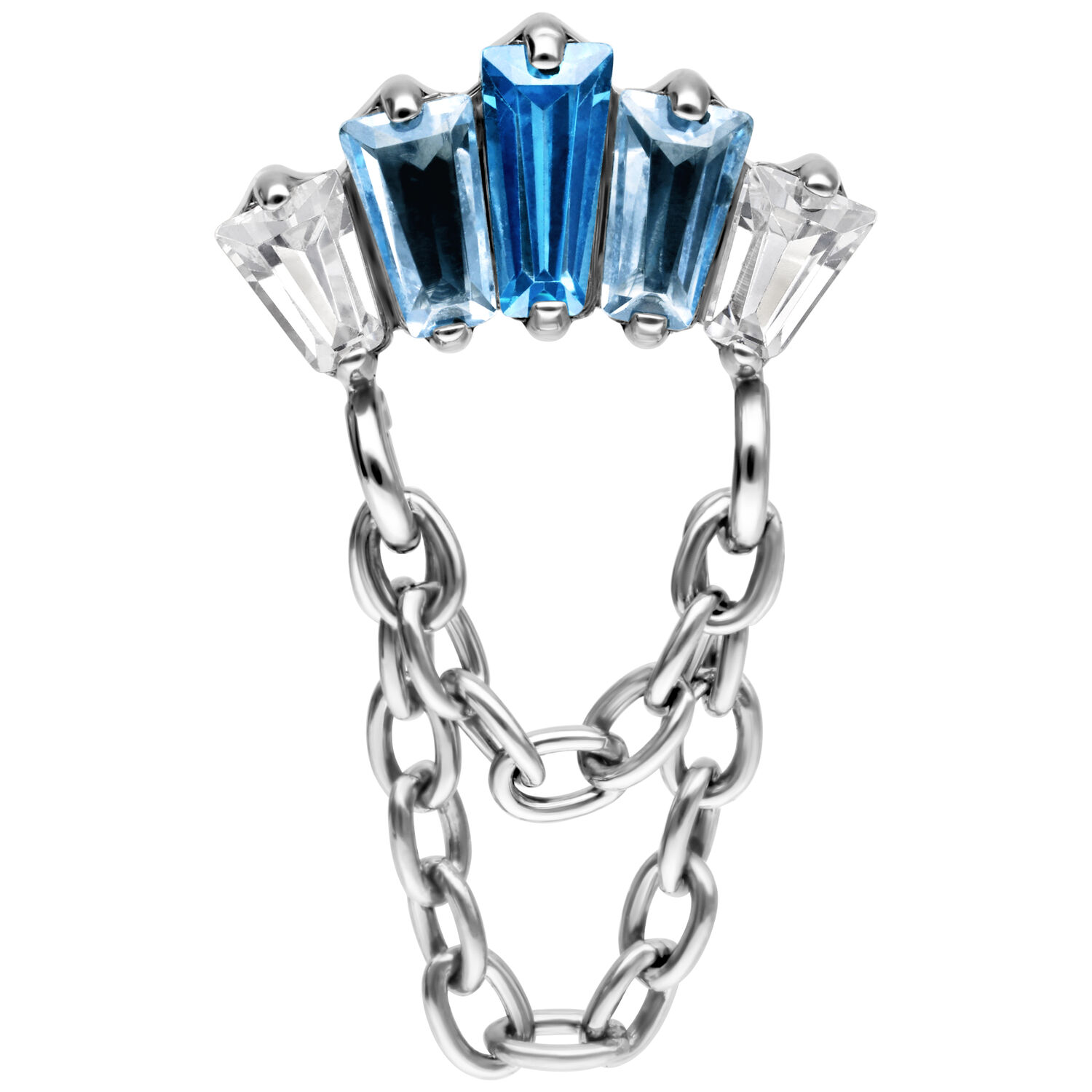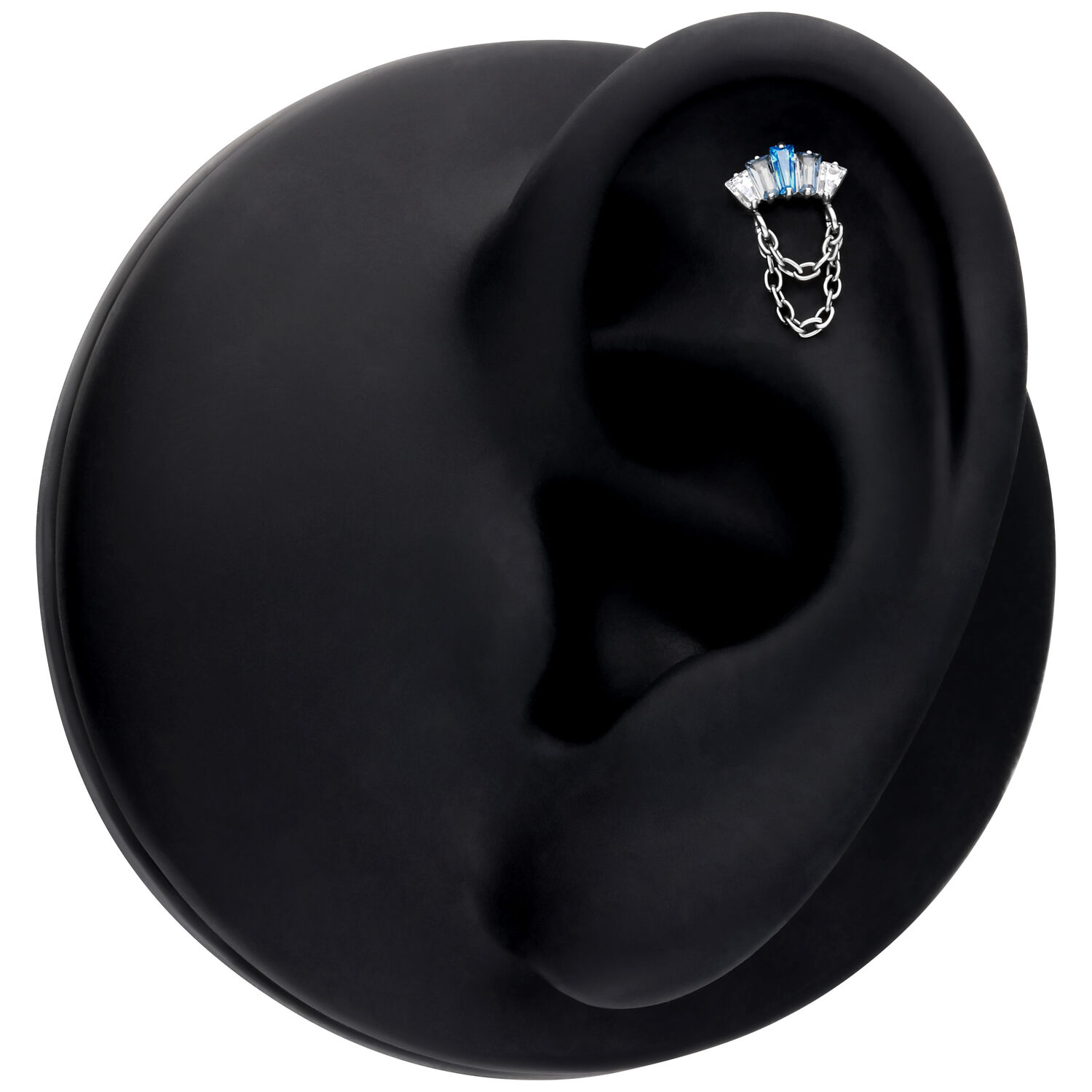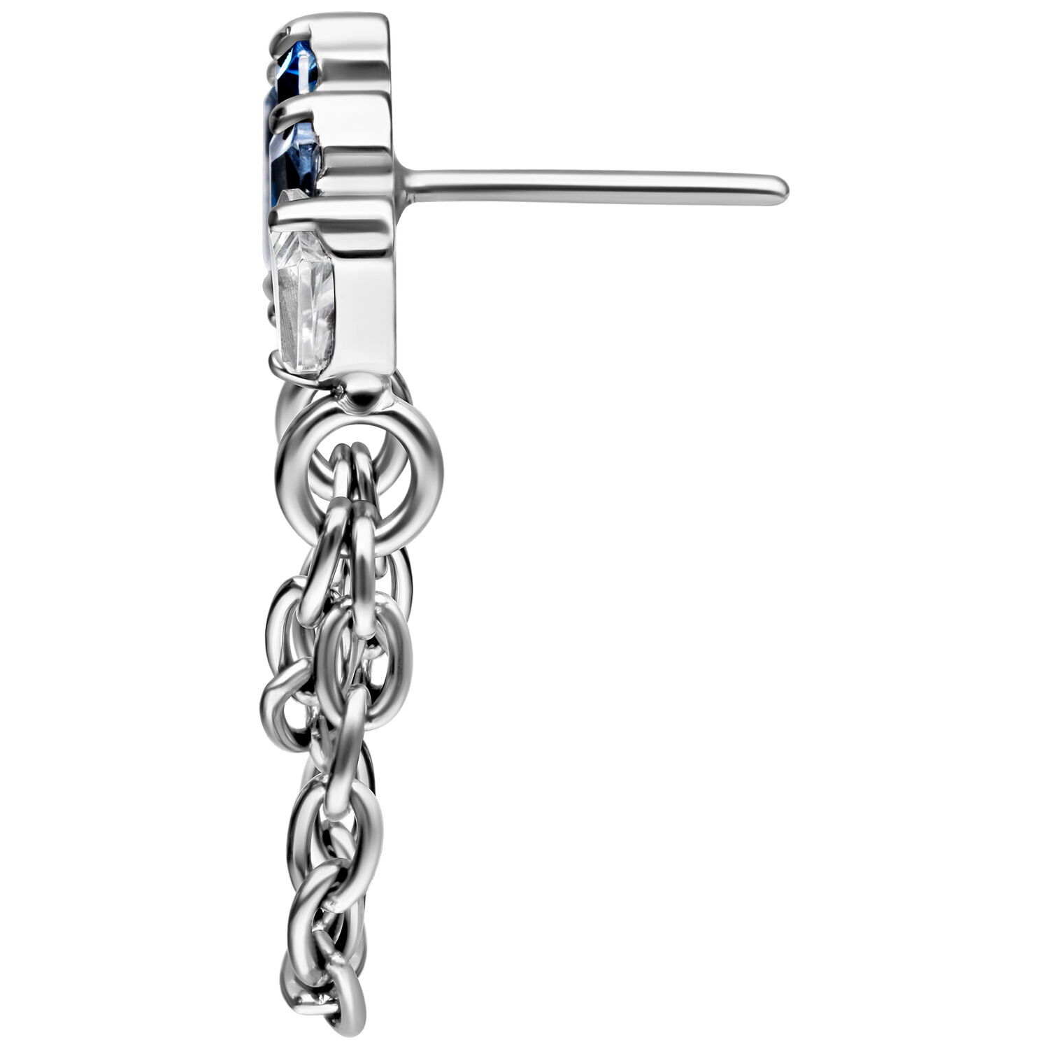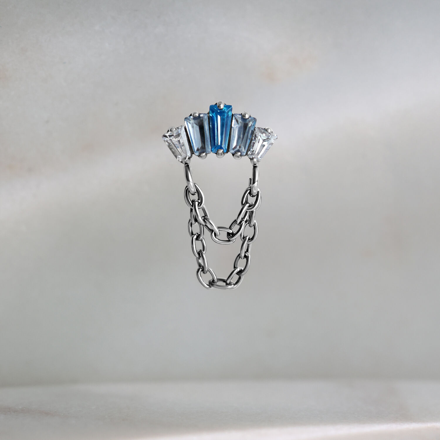 Los cristales en turquesa y lavanda florecen en una disposición delicada, captando la luz con cada movimiento. Dos finas cadenas de plata o de oro complementan el diseño, aportando al attachment un carácter lujoso y fluido, un detalle que llama la atención al instante y da a tu piercing una profundidad incomparable.