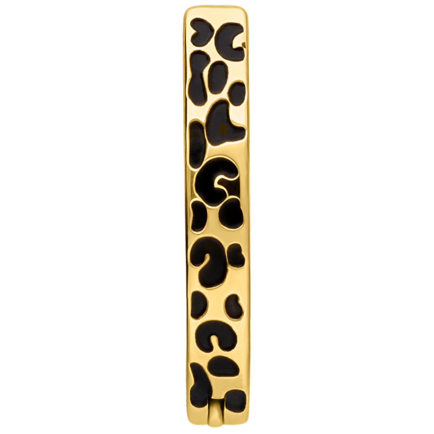 El estampado de leopardo está en todas partes, y nadie se escapa de esta tendencia. Con el Leopard Belly Arch Clicker llevas el look salvaje directamente a tu piercing de ombligo. Fabricado en titanio de alta calidad apto para implantes (Ti6AL4V ELI ASTM F-136) y decorado con un llamativo patrón de leopardo en esmalte negro, esta joya se convierte en tu nueva pieza estrella.