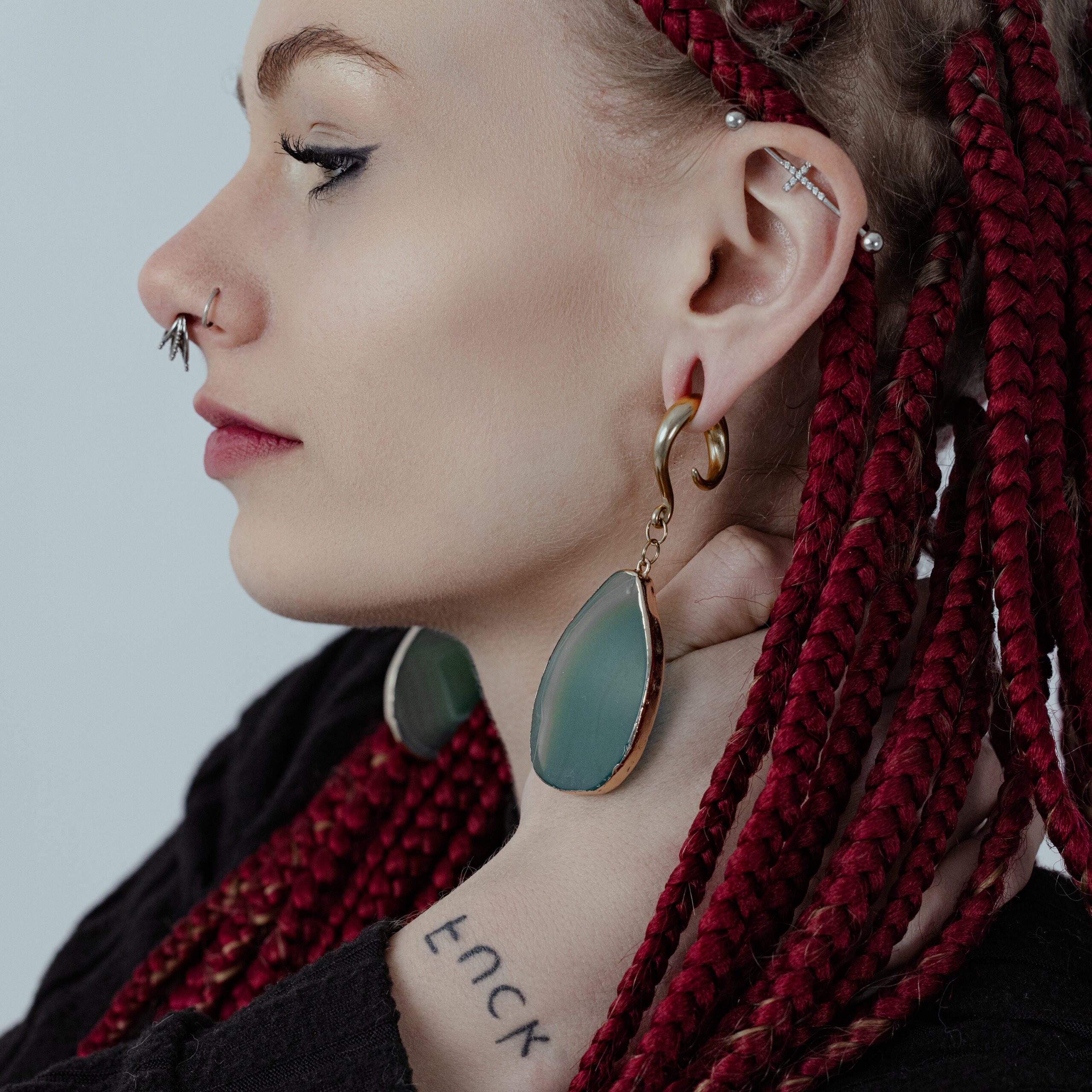 A diferencia de nuestros túneles, estos elegantes earweights vienen en pares. Los ganchos están hechos de acero quirúrgico 316L de alta calidad y los colgantes son de piedra natural. Para que tus Earweights sigan siendo un verdadero atrapa miradas, es mejor quitarlos antes de nadar o ducharte.