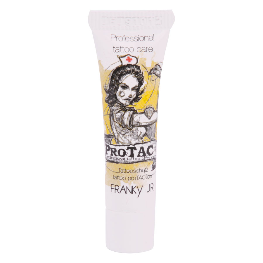 Como único producto en el mercado de cuidados para tatuajes, proTAC ha demostrado su eficacia a través de investigaciones médicas. Los productos Franky Jr. (3 ml) y Peggy Mae (10 ml) solo se diferencian en el tamaño. Mientras que Franky Jr. es ideal para tatuajes pequeños de hasta 10×10 cm, Peggy Mae es adecuada para tatuajes más grandes. Después de la fase de protección (3-4 días), es mejor cambiar a nuestro cuidado a largo plazo para tatuajes, Long John. Long John cubrirá adecuadamente los días y semanas siguientes con sus 100 ml.