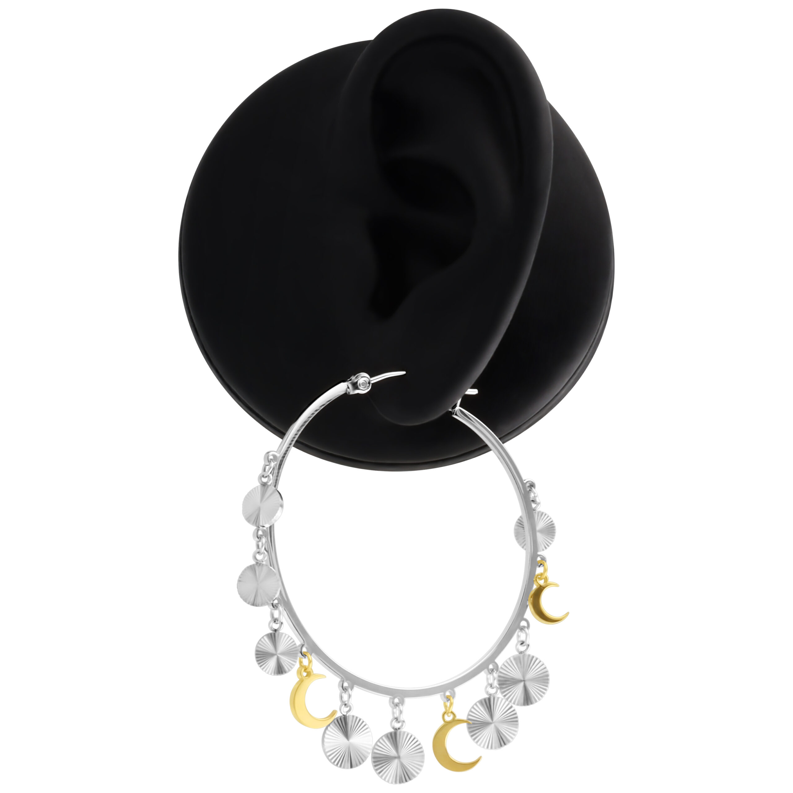 No importa si tu estilo es casual, deportivo, clásico o extravagante, estos aros de acero inoxidable te convertirán en una verdadera ícono de STEEL. El toque especial son los delicados símbolos de luna que brillan a la luz, añadiendo a tu look un toque de misterio. La luna simboliza cambio, intuición y fuerza femenina. Estos aros le dan a tu estilo una elegancia mística, siendo el acompañante perfecto para momentos llenos de confianza.