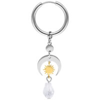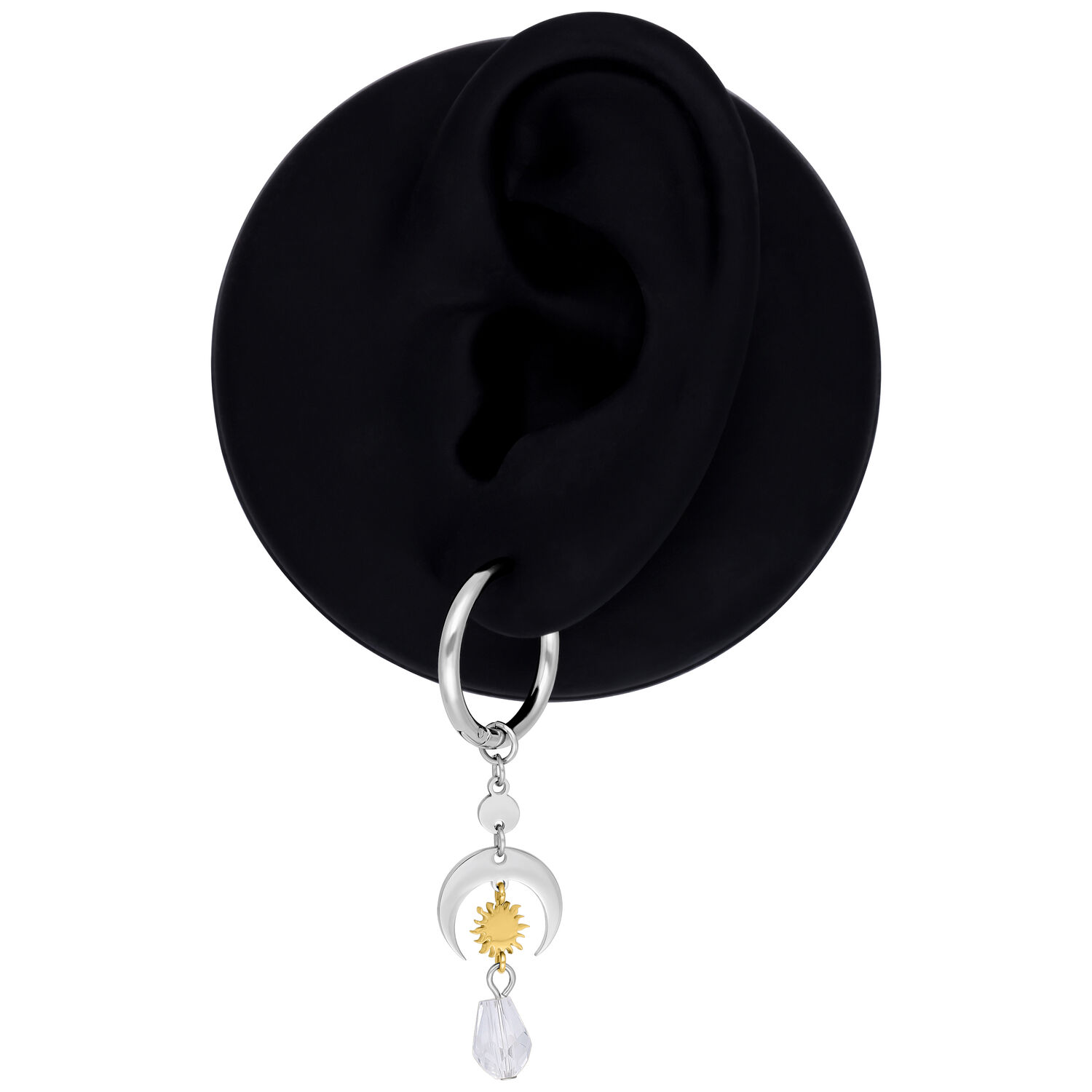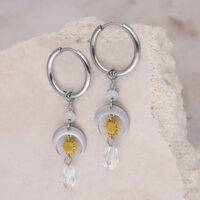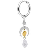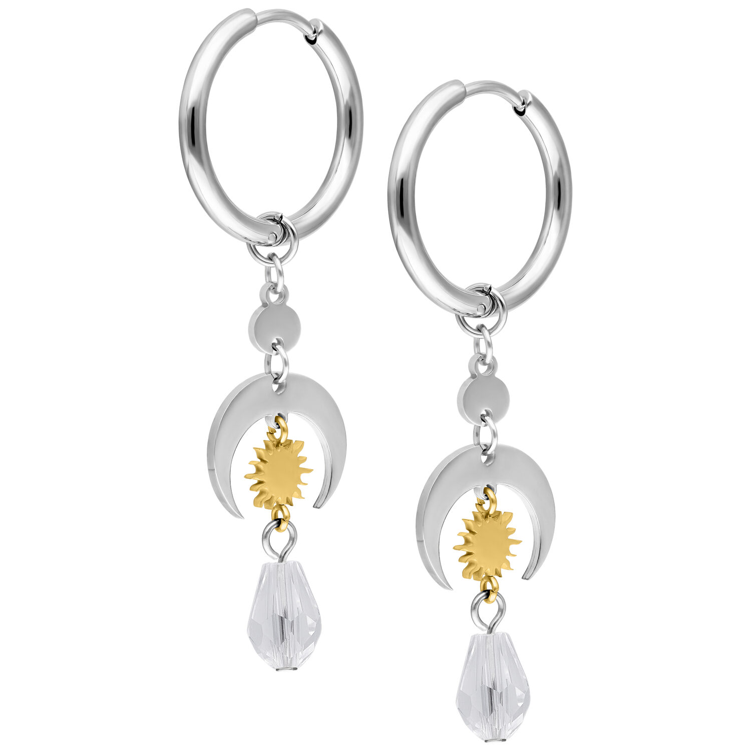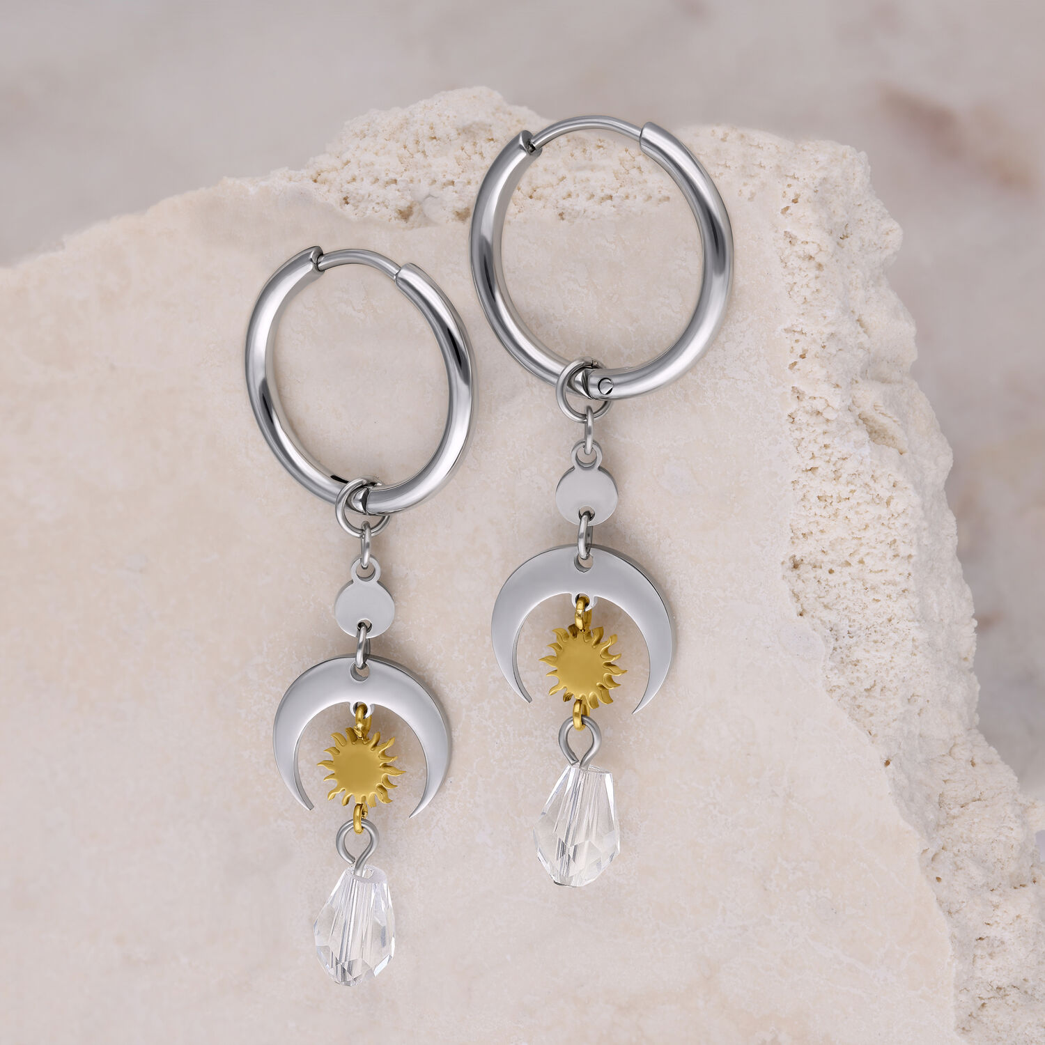 Los Aros Celestial Light combinan formas metálicas limpias con elementos simbólicos inspirados en el cielo. Bajo los aros clásicos se despliega un diseño en varias partes: una media luna abierta, un delicado sol en acabado dorado y un colgante transparente facetado en forma de gota que refleja suavemente la luz.
