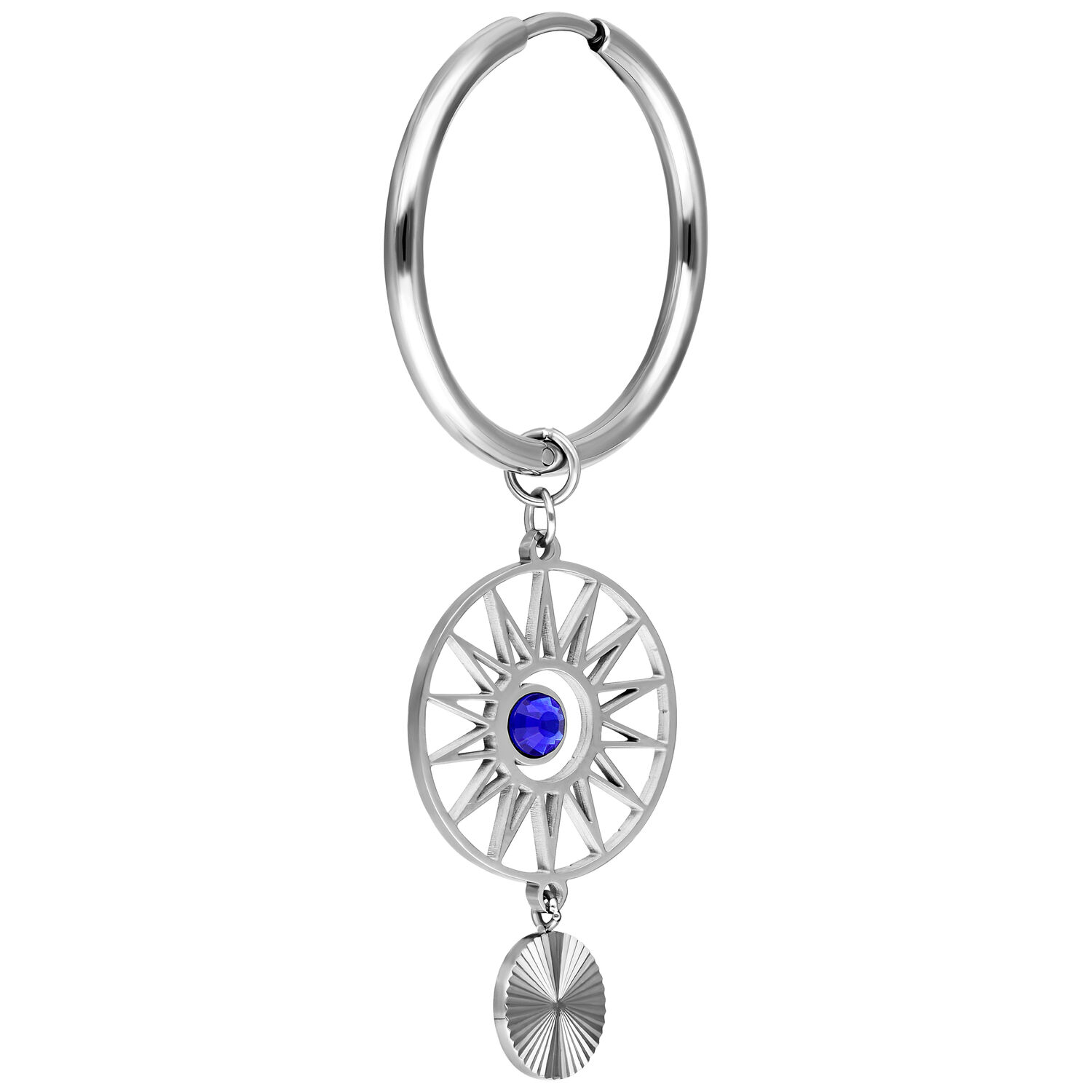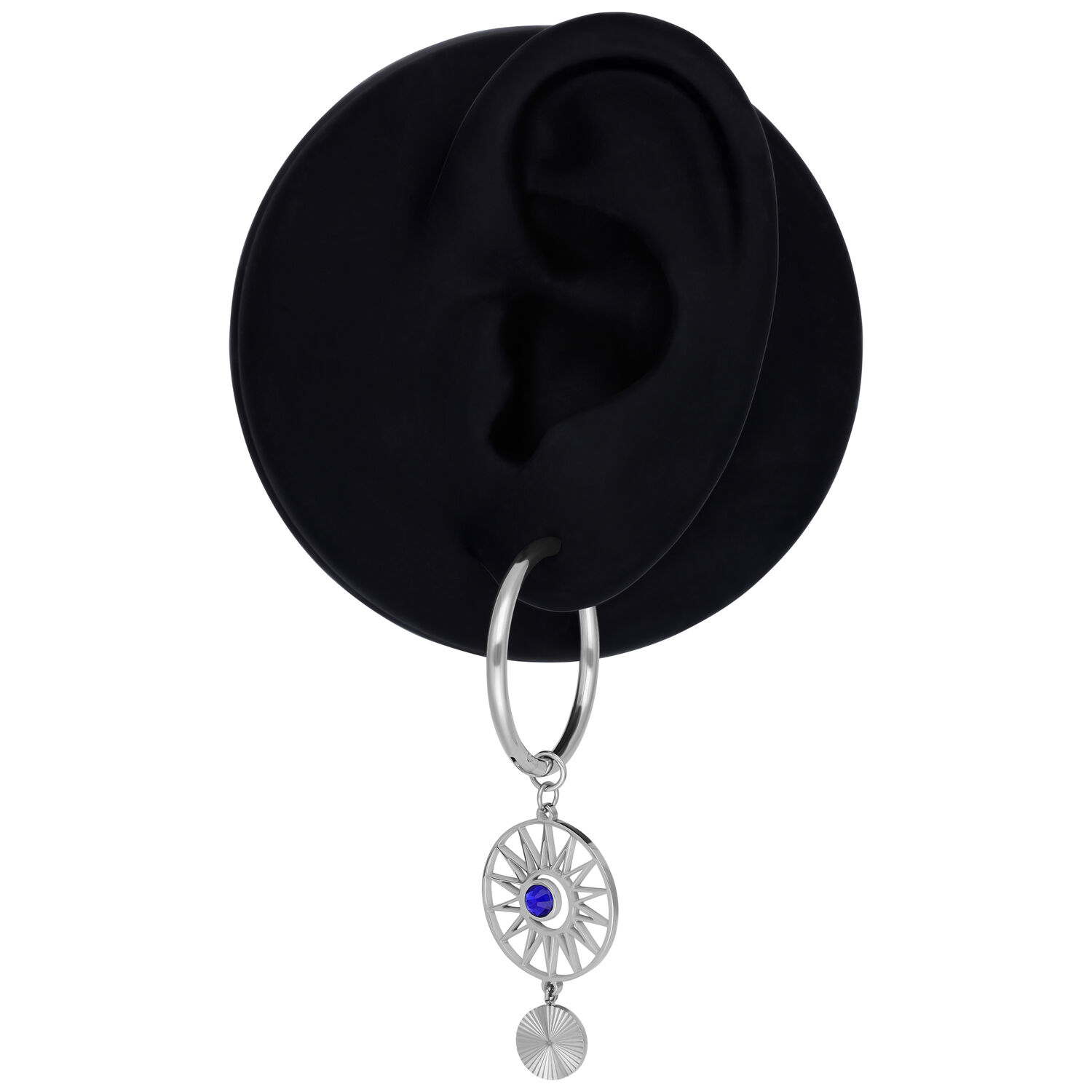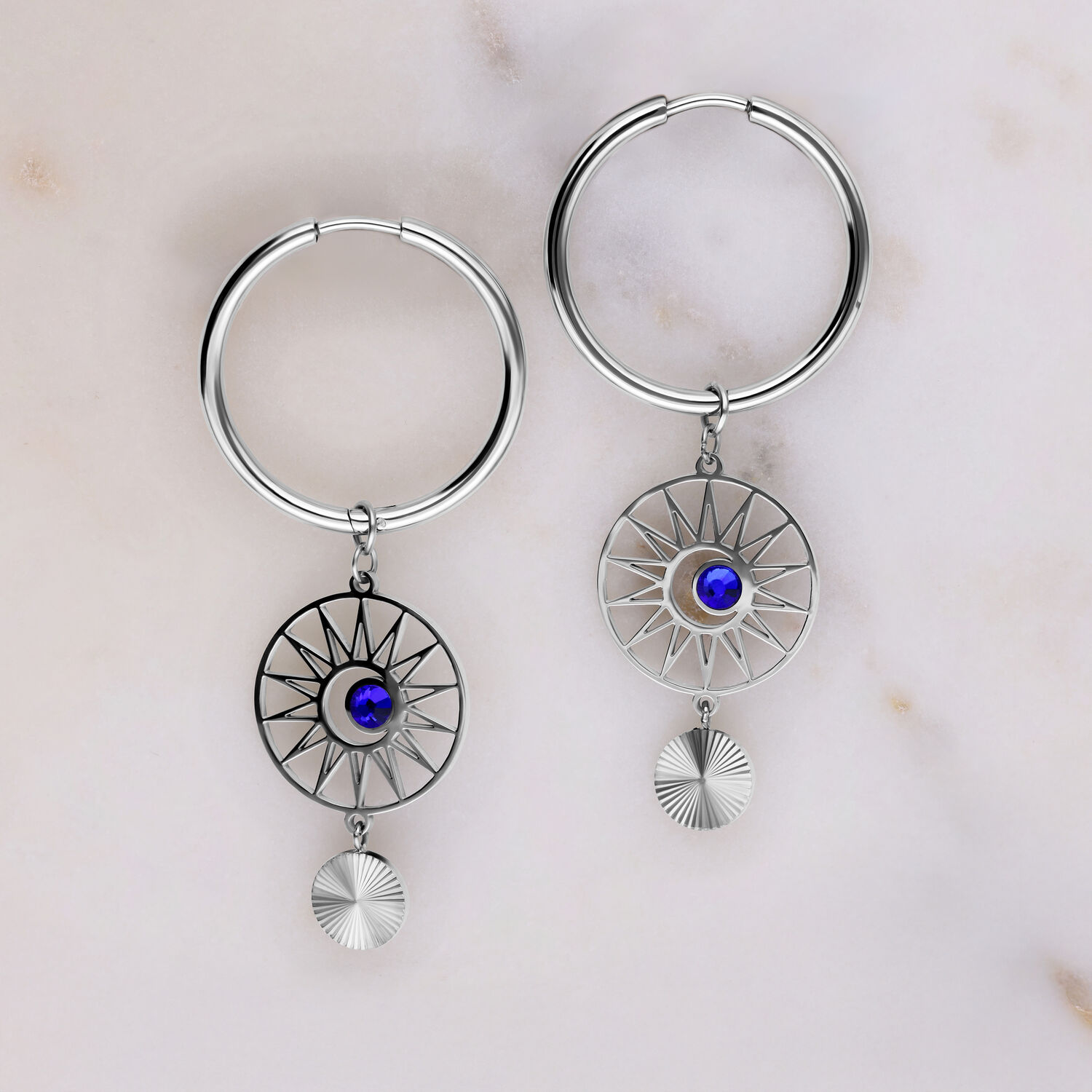 Los Aros Celestial Orbit combinan un diseño llamativo, inspirado en el cosmos, con detalles delicados. El colgante circular con estructura en forma de rayos enmarca un cristal de circonia azul, que actúa como elemento central para un acento claro y brillante. Un colgante adicional y móvil aporta profundidad y un movimiento suave al conjunto.