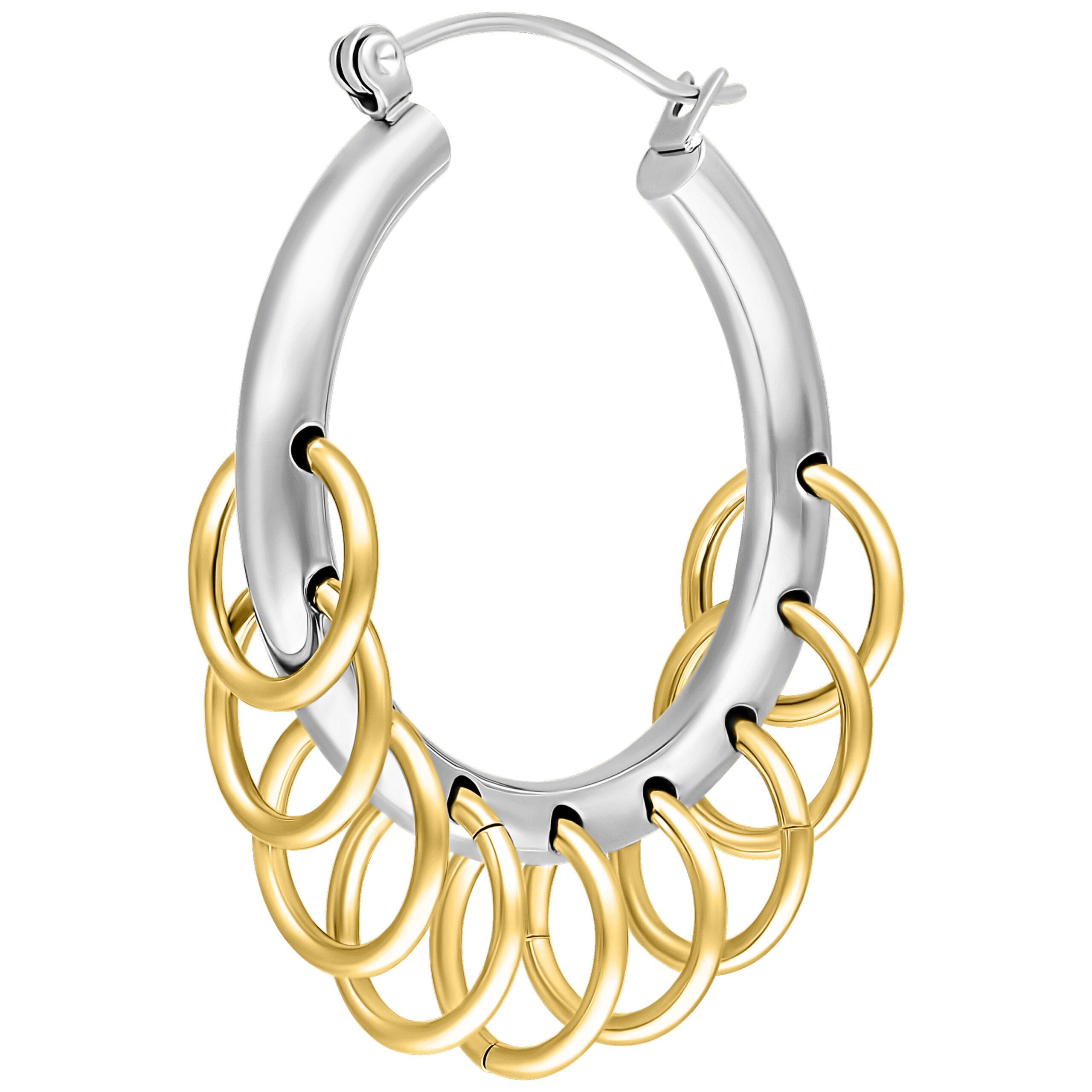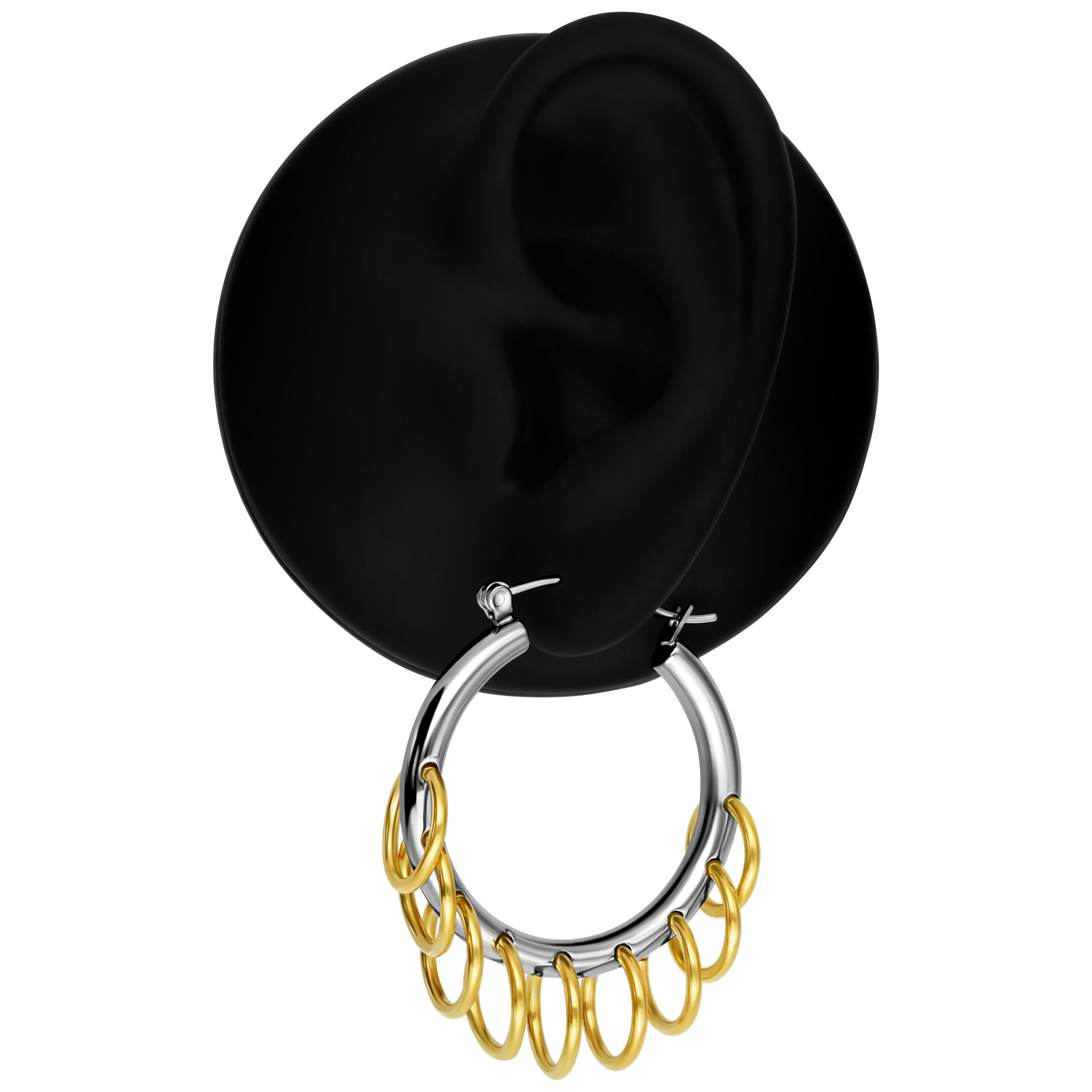 Nuestros extravagantes aros con lazos ofrecen un look moderno y diferente. Estos grandes pendientes están adornados con pequeños anillos y combinan dos colores de metal con un estilo punk audaz.