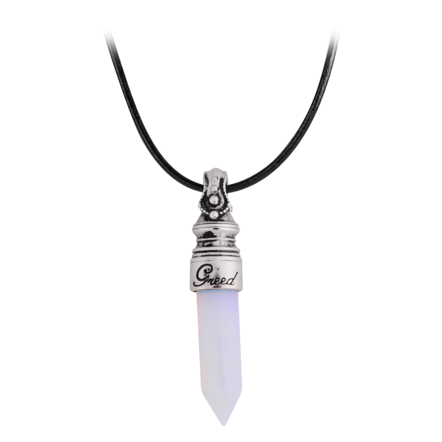 Esta increíble cadena forma parte de nuestra colección Mysterium y representa el pecado capital “Avaricia”. Está compuesta por una montura de acero inoxidable trabajada con detalle y con la inscripción del pecado en inglés. La cadena es de cuero de alta calidad. Una piedra sintética de forma cilíndrica tipo ópalo encarna el pecado capital “Avaricia”.