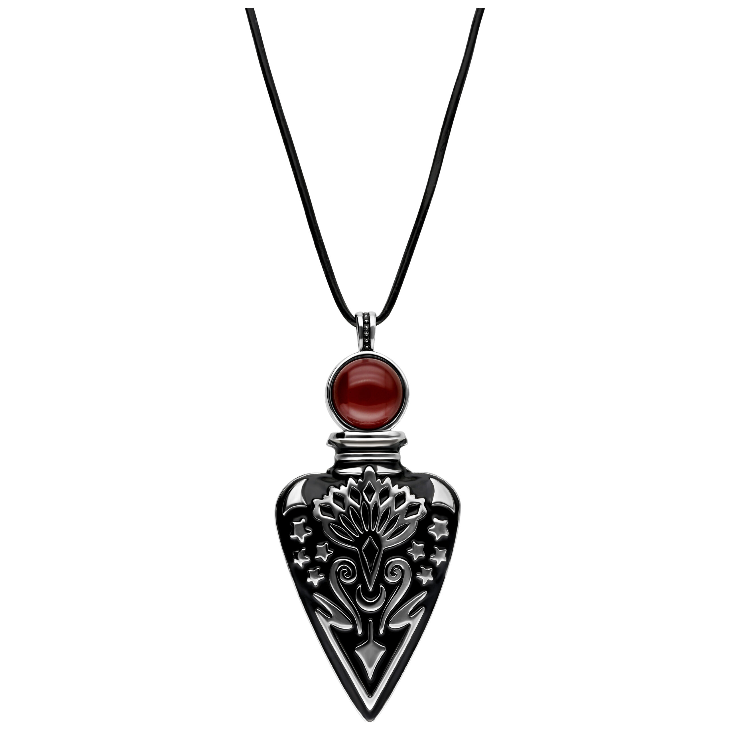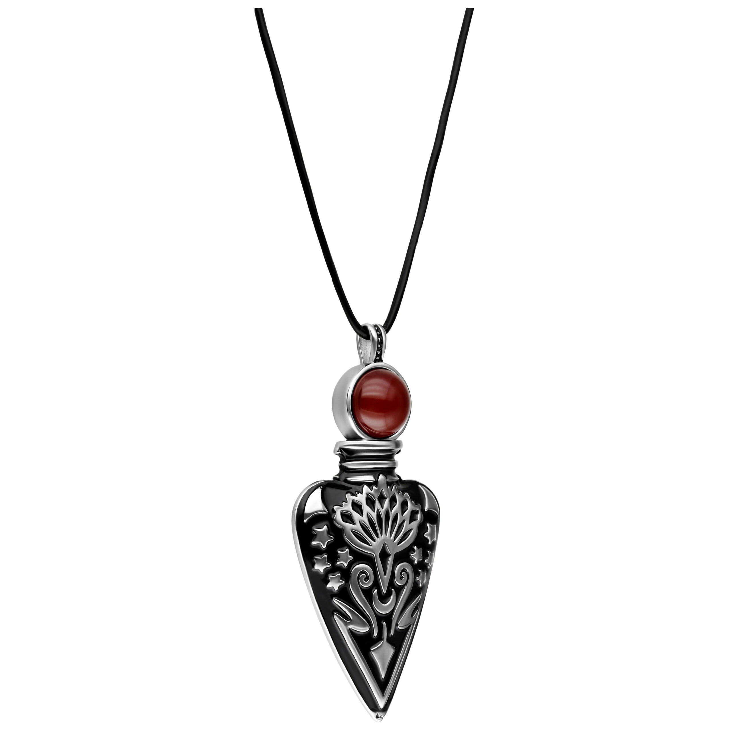 La banda negra de cuero resistente complementa perfectamente el colgante, dándole un toque auténtico y natural. Con su estilo místico, nuestra cadena es una pieza de declaración que expresa tanto individualidad como conciencia del estilo.