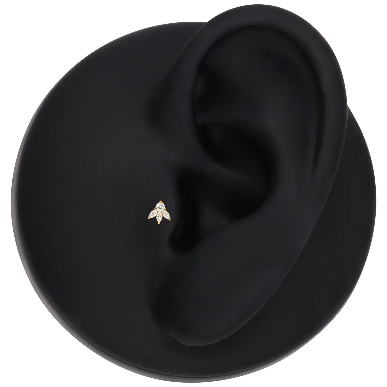 Adornado con brillantes piedras de moissanita, el accesorio brilla con una luminosidad excepcional y aporta un toque elegante y armonioso a cualquier look. Gracias a su fabricación precisa y al ajuste perfecto en el Perfect Fit Labret (14K), ofrece una sujeción segura, cómoda y respetuosa con la piel, ideal para quienes aprecian los piercings de lujo con significado.