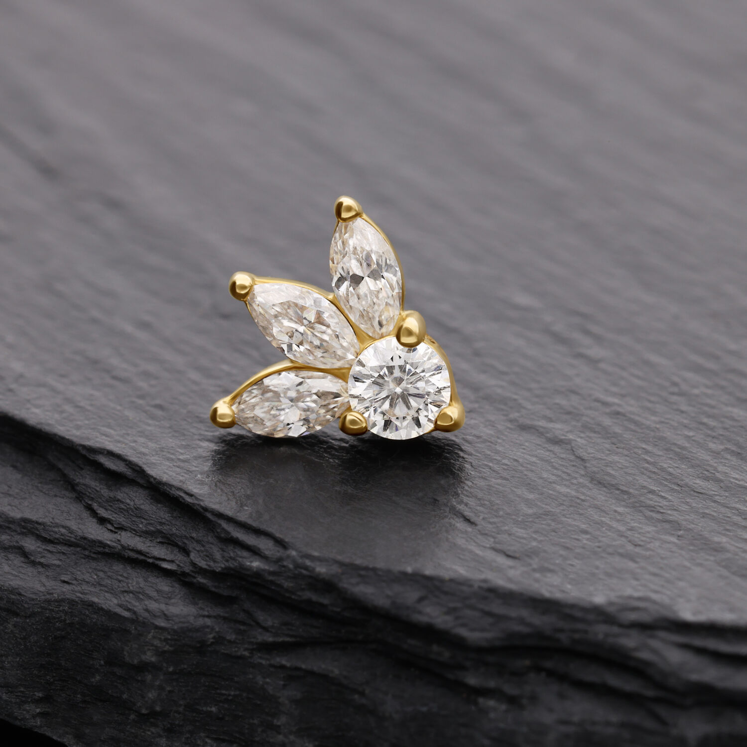 El 14K Perfect Fit Moissanit Lotus Attachment representa la elegancia lujosa y la belleza simbólica. Fabricado en oro amarillo pulido de 14 quilates (585), este refinado accesorio de piercing destaca por su delicado diseño de loto, un símbolo de pureza, fuerza y equilibrio interior.