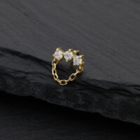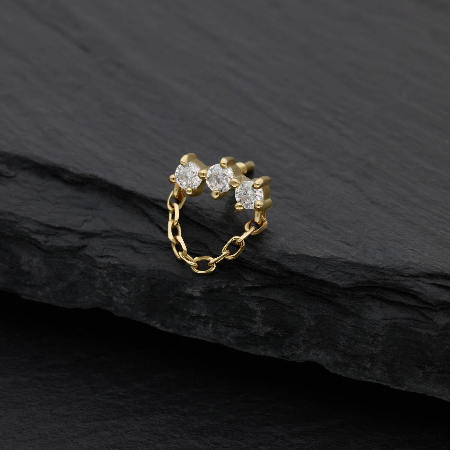 El 14K Perfect Fit Moissanit Bow con colgante combina diseño moderno con un toque sofisticado. Fabricado en oro amarillo pulido de 14 quilates (585), este accesorio para piercing destaca por tres piedras Moissanit cortadas en brillante, unidas por una delicada cadena móvil: una mezcla elegante de estructura delicada y brillo lujoso.