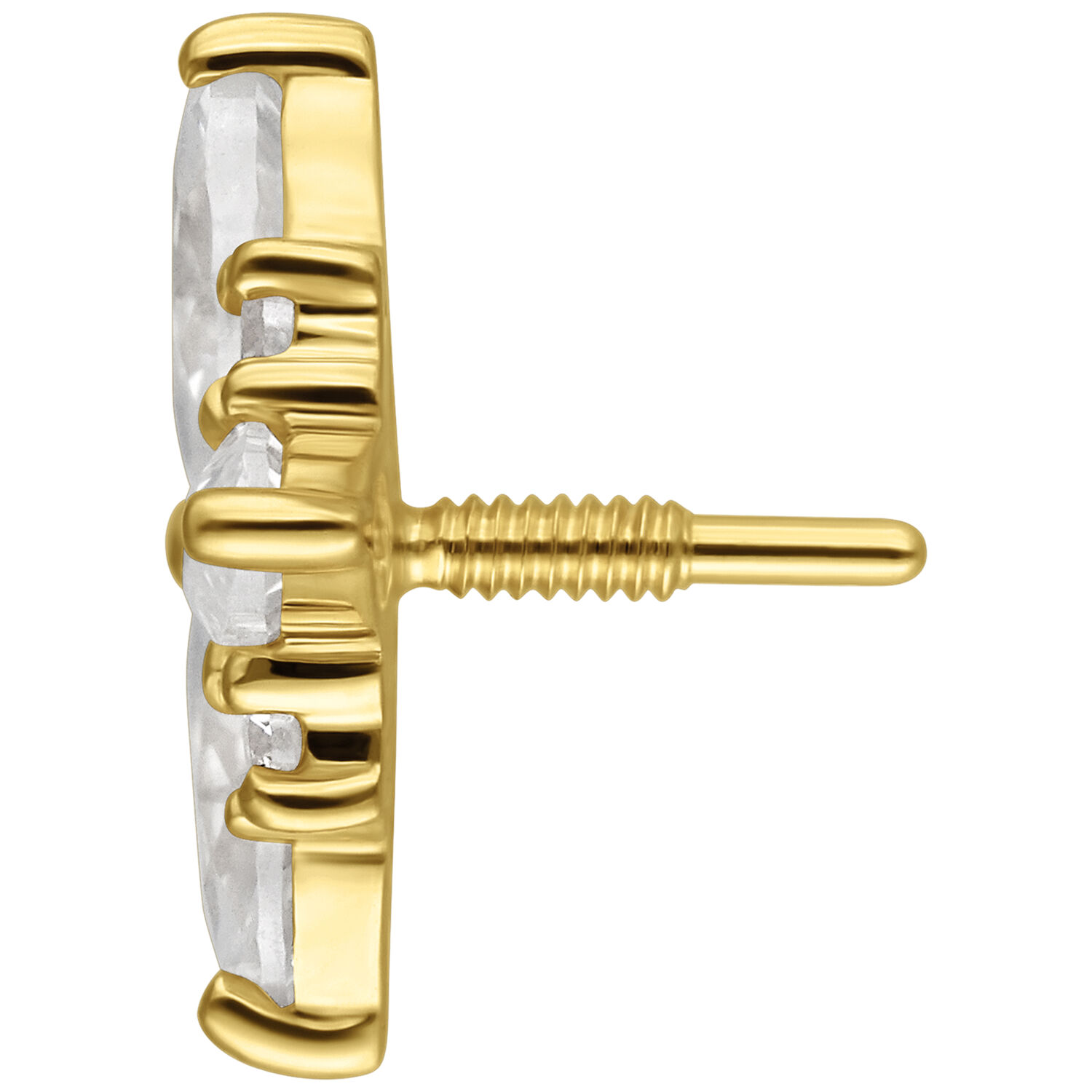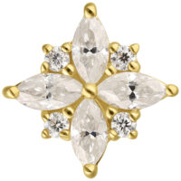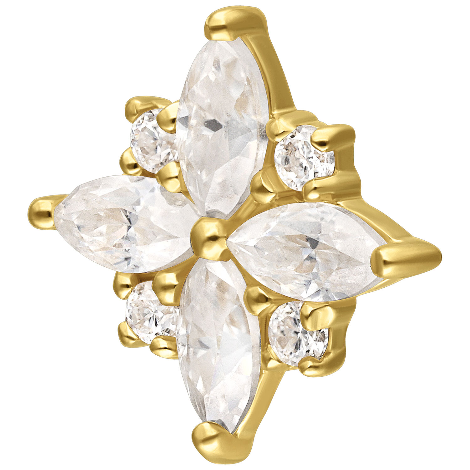 El 14K Perfect Fit Moissanit Crystal Blossom Attachment combina artesanía lujosa con elegancia atemporal. Fabricado en oro amarillo pulido de 14 quilates (585), este accesorio para piercing destaca por un diseño floral elaborado con cristales Moissanit cortados en marquise y redondo, que crean un juego de luces excepcional.