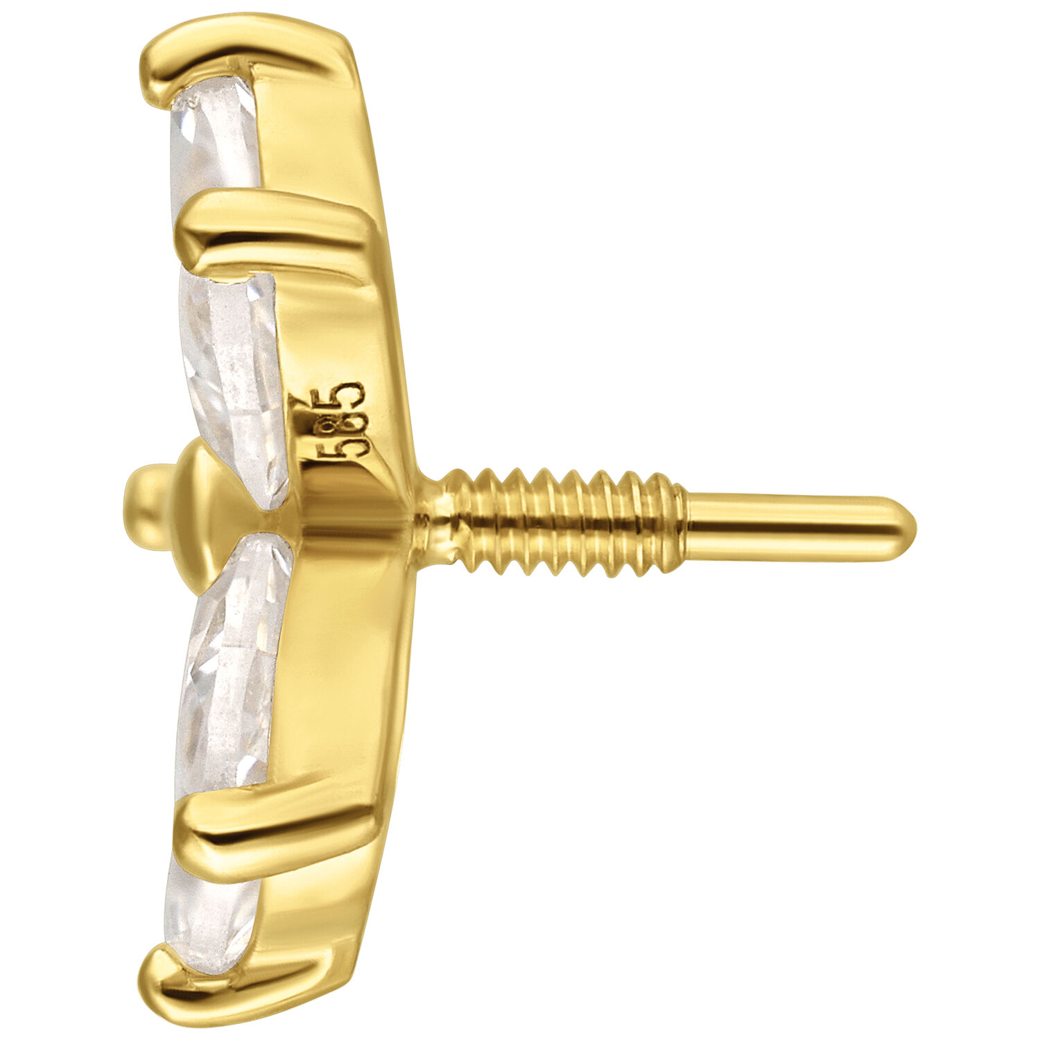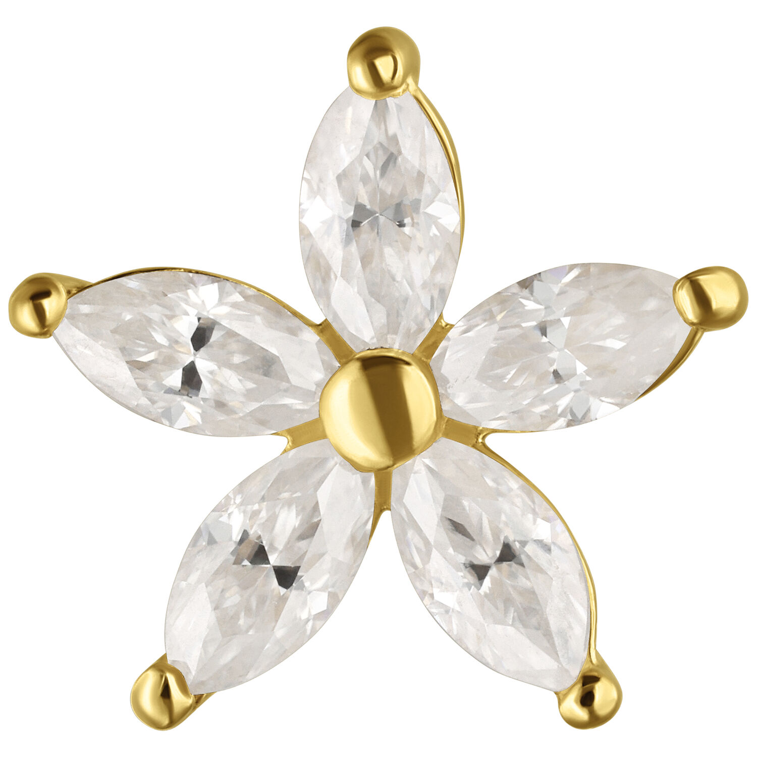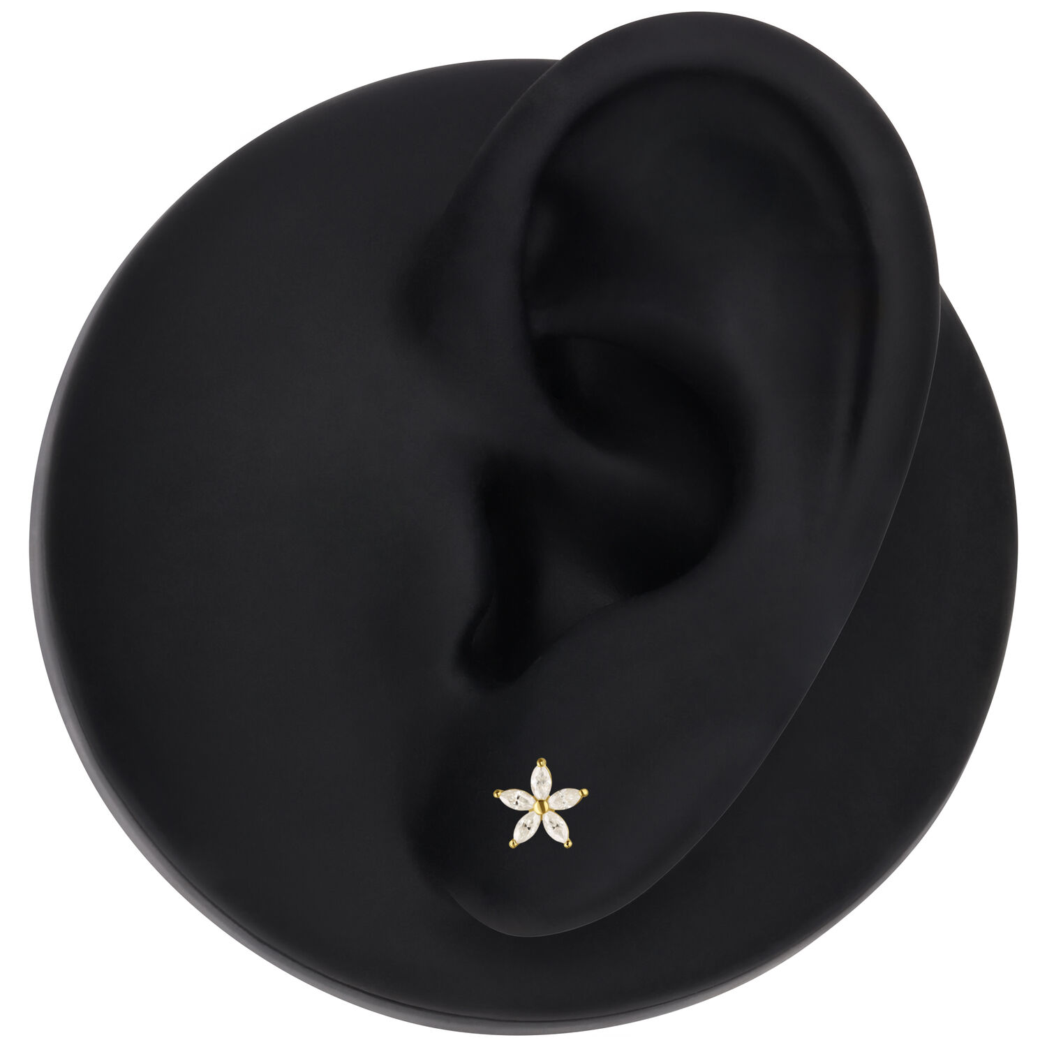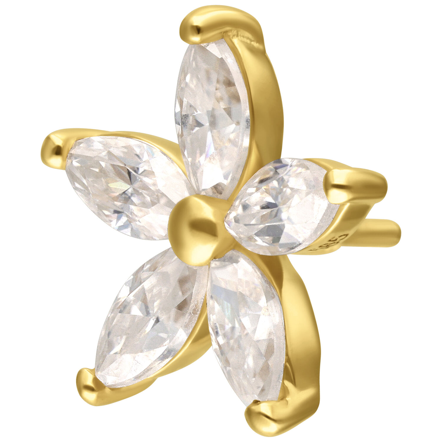 El 14K Perfect Fit Moissanit Flower Attachment combina elegancia de lujo con un diseño delicado. Fabricado en oro amarillo pulido de 14 quilates (585), este accesorio de piercing destaca por su fina forma de flor, realzada con brillantes piedras de moissanita. Su resplandor excepcional captura la luz desde todos los ángulos, creando un look femenino y radiante.