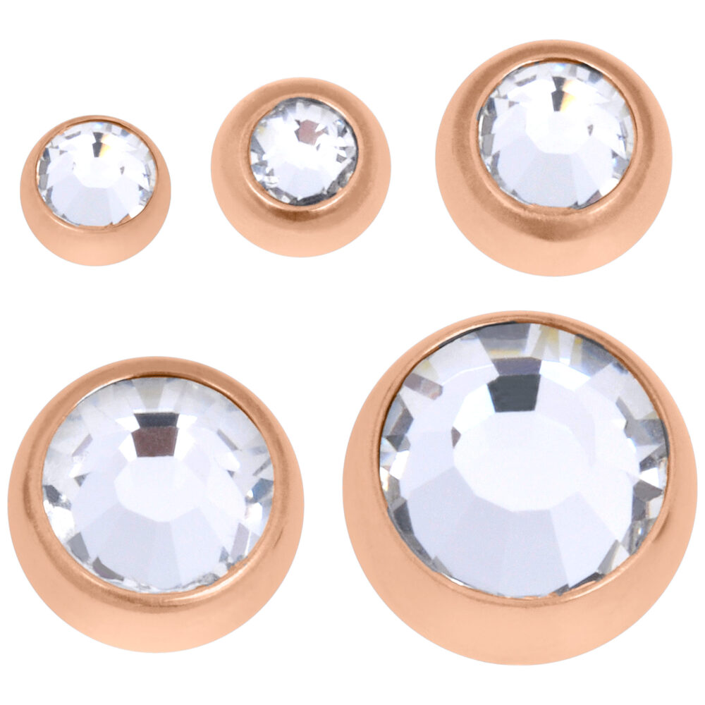 ¡Ahora puedes obtener las esferas para los barbells con rosca externa de la Titan Rosegoldline también con cristal elegante! Estas esferas están disponibles en diferentes combinaciones de diámetro, rosca y color.