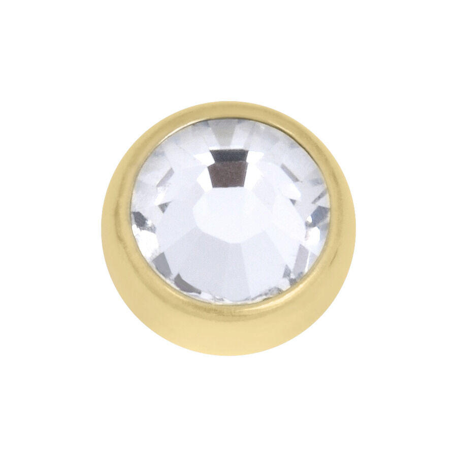 Bola roscada de oro amarillo de 750 (18K) con cristal, para enroscar en barras con rosca. Esta bola está disponible en diferentes tamaños y grosores de rosca. Este artículo es relativamente pesado y no esterilizable en Autoclave. El material es seguro cuando se usa de forma adecuada.