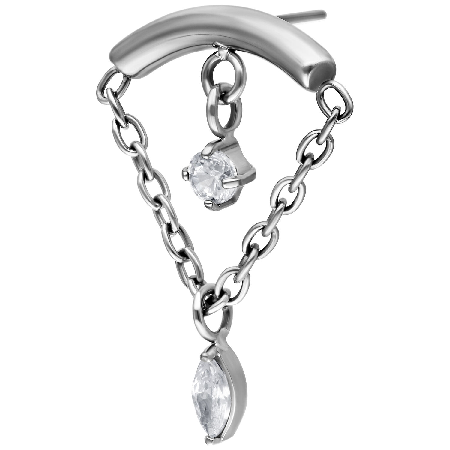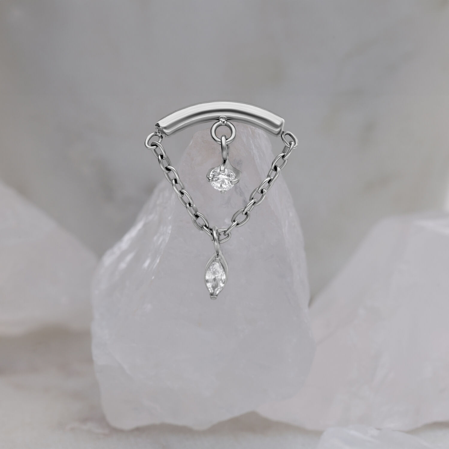 The Double Jewelled Hidden Helix Push Fit Attachment is a refined helix accessory designed to sit subtly within the ear fold. The curved bar made from Grade 23 titanium anchors discreetly in your helix piercing, while two delicate chains drop gracefully, showcasing a sparkling round crystal at the top and a marquise-cut crystal below.