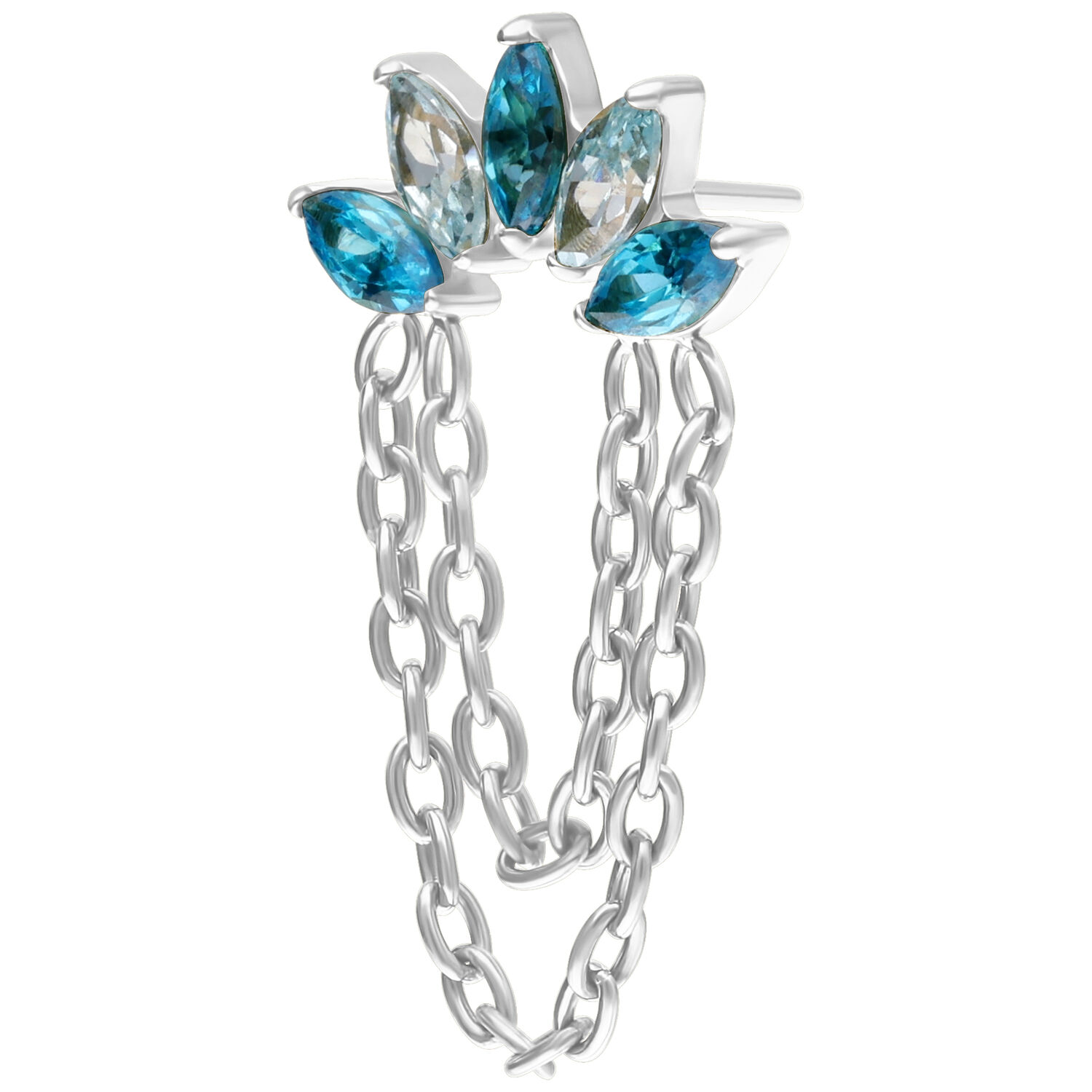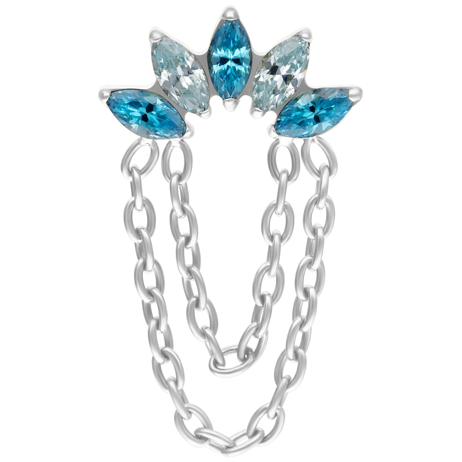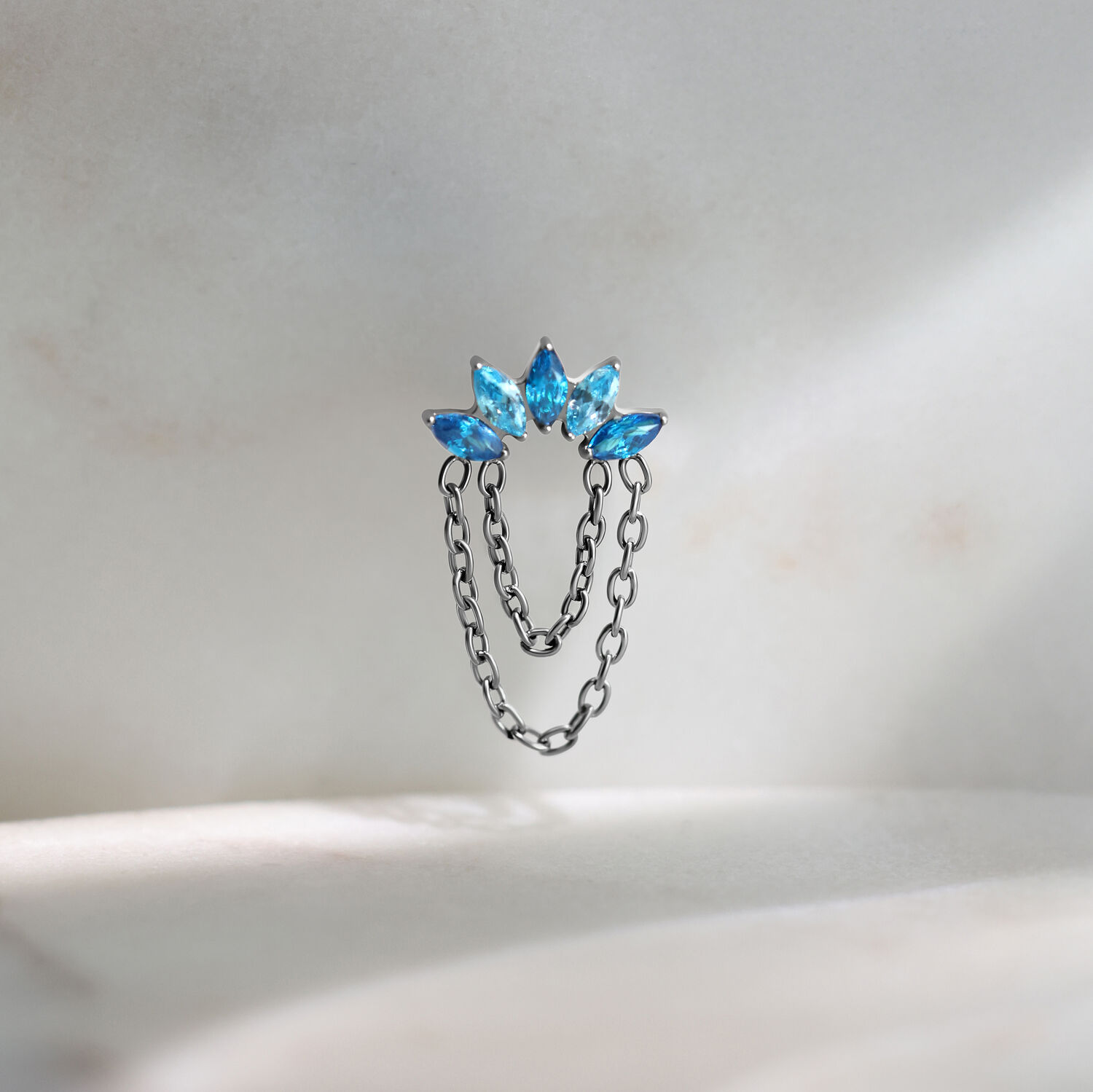 Los cristales en turquesa y lavanda florecen en una disposición delicada, captando la luz con cada movimiento. Dos finas cadenas de plata o de oro complementan el diseño, aportando al attachment un carácter lujoso y fluido, un detalle que llama la atención al instante y da a tu piercing una profundidad incomparable.