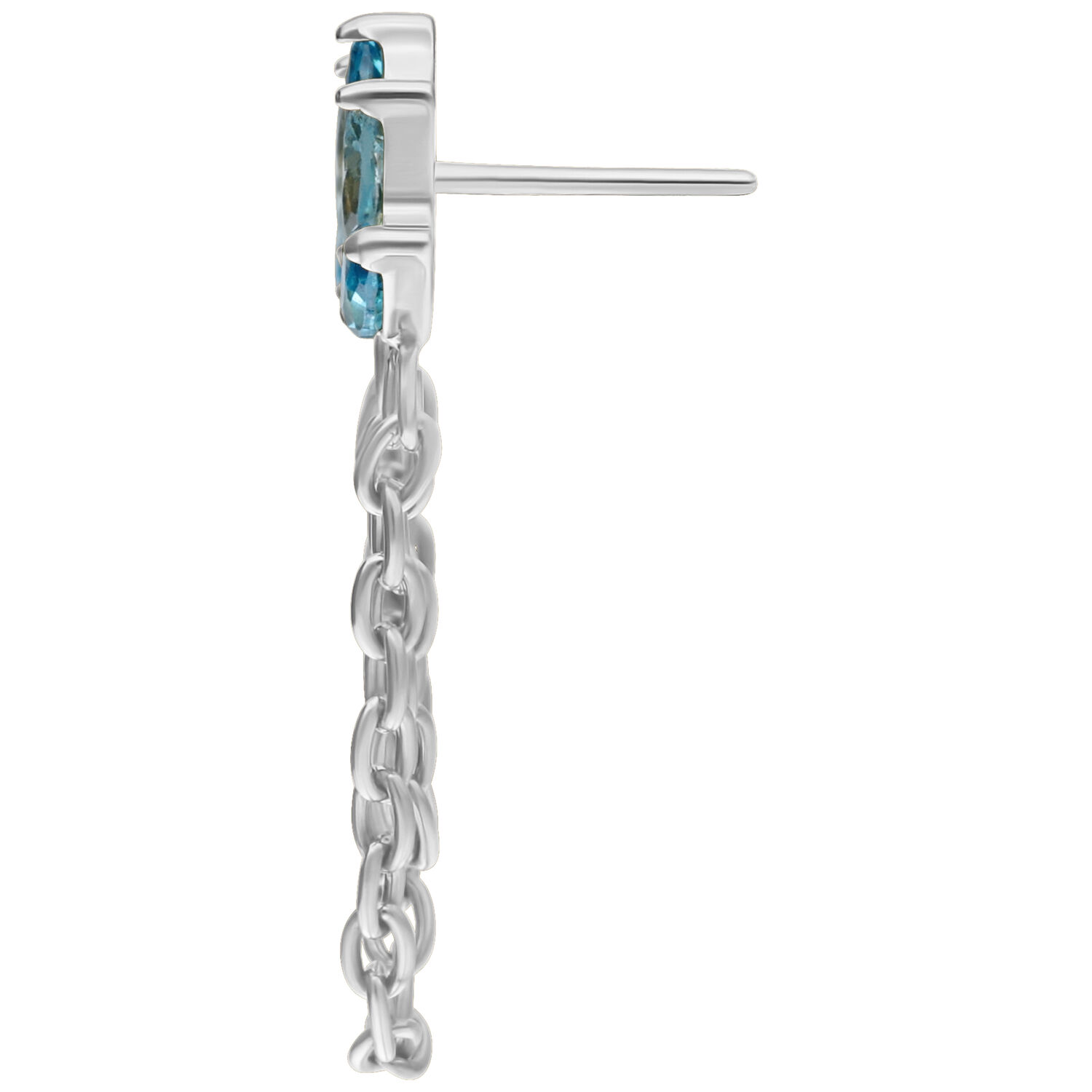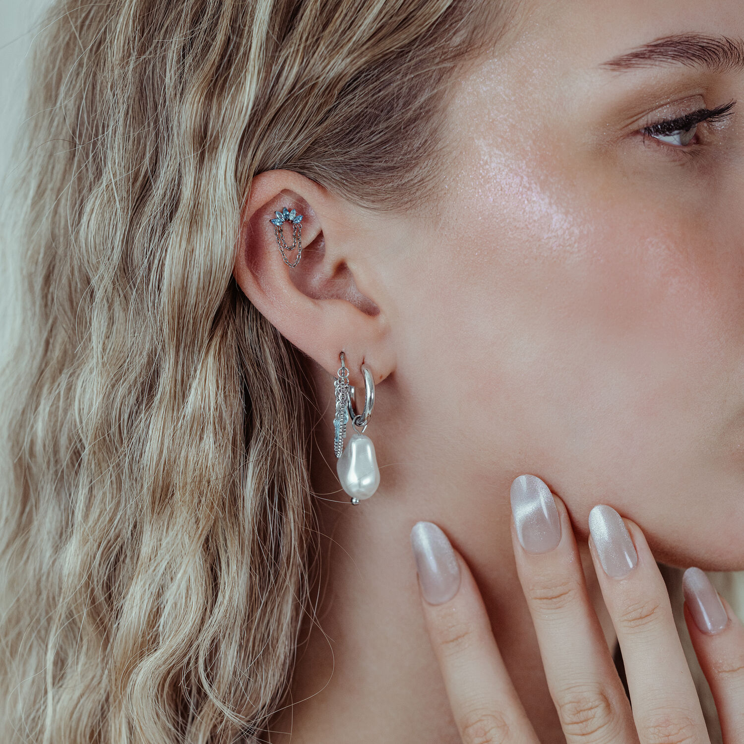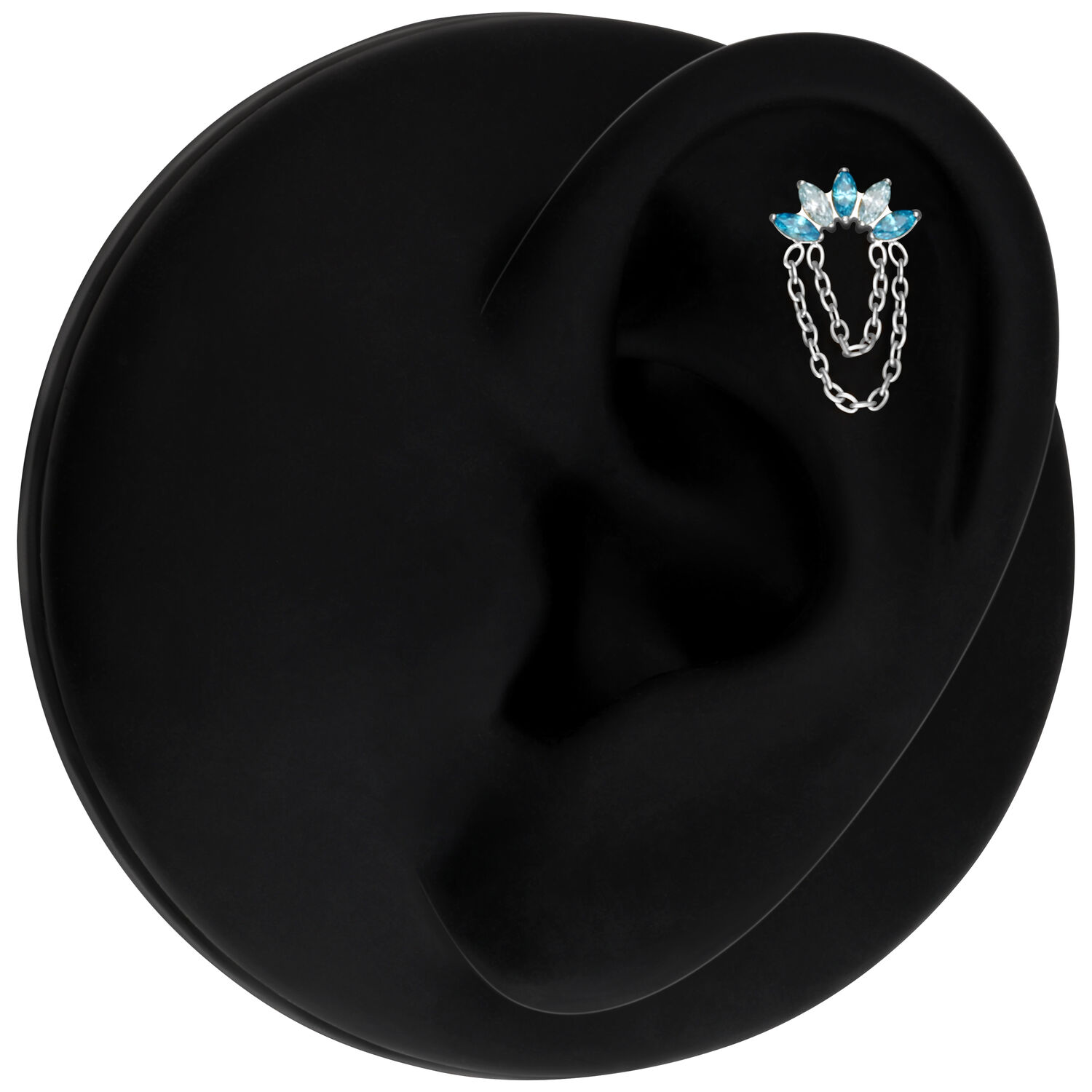 Los cristales en turquesa y lavanda florecen en una disposición delicada, captando la luz con cada movimiento. Dos finas cadenas de plata o de oro complementan el diseño, aportando al attachment un carácter lujoso y fluido, un detalle que llama la atención al instante y da a tu piercing una profundidad incomparable.