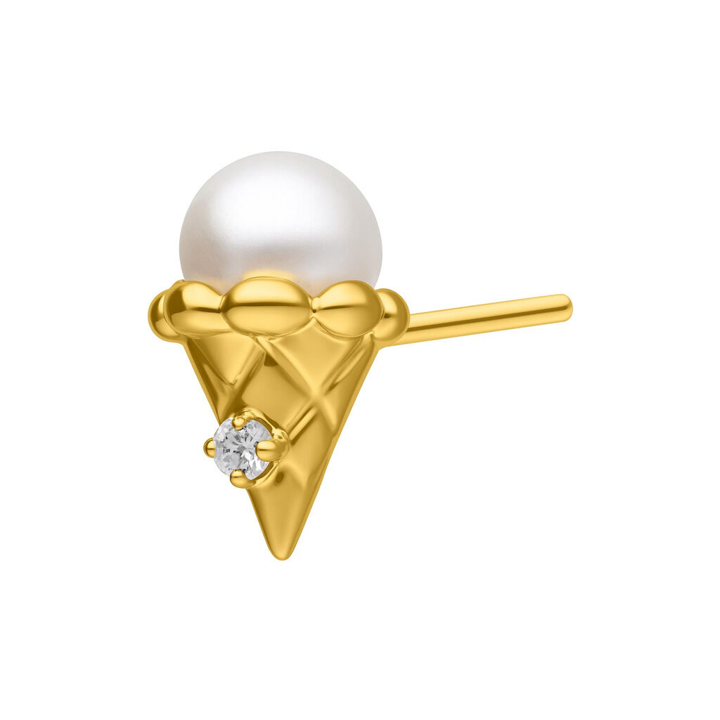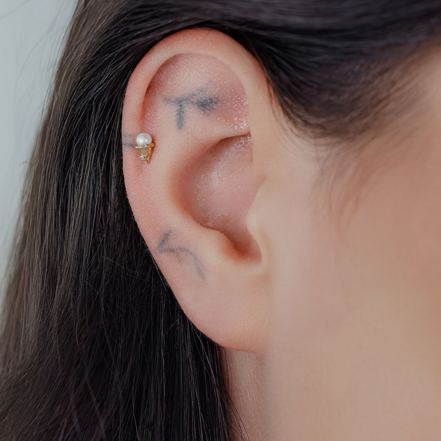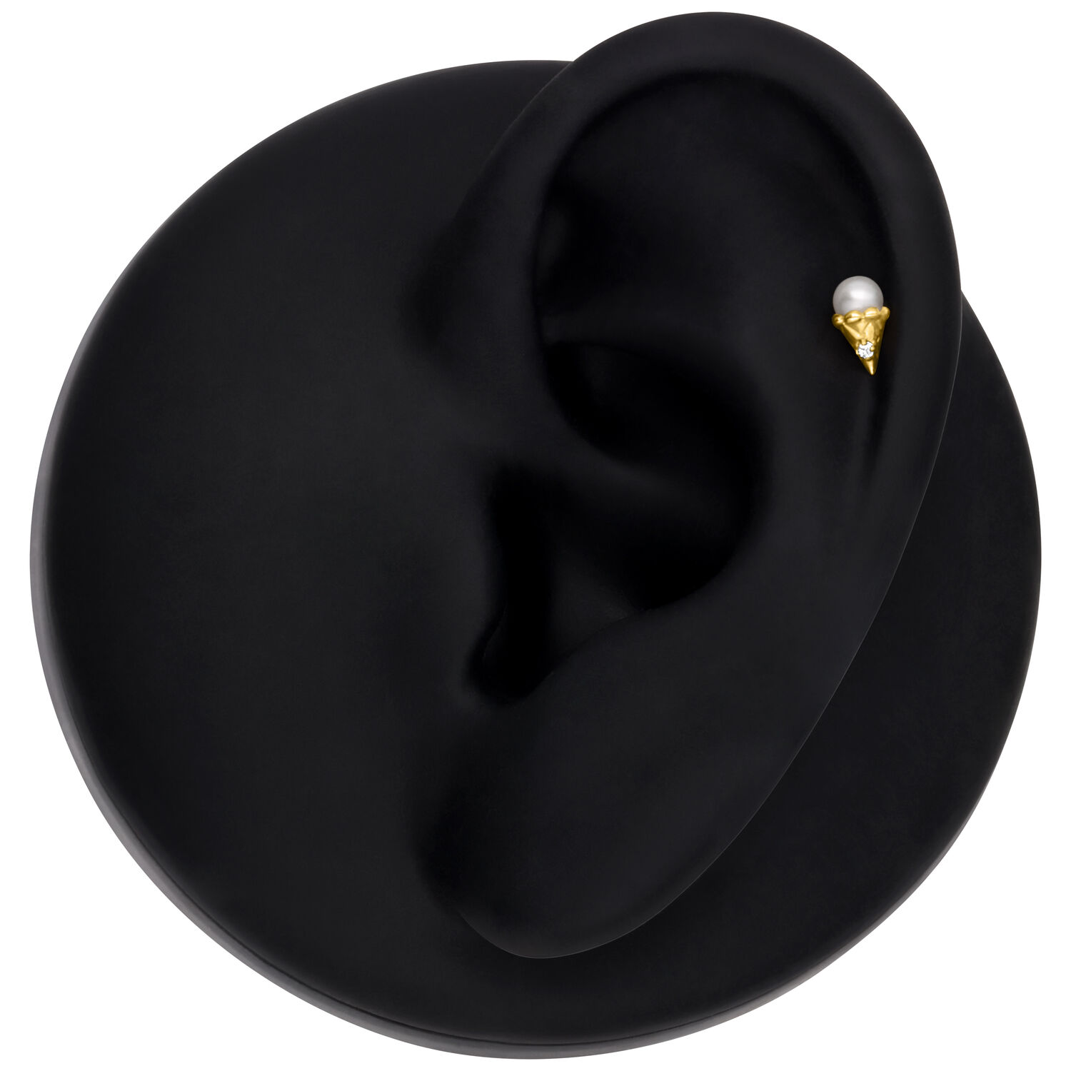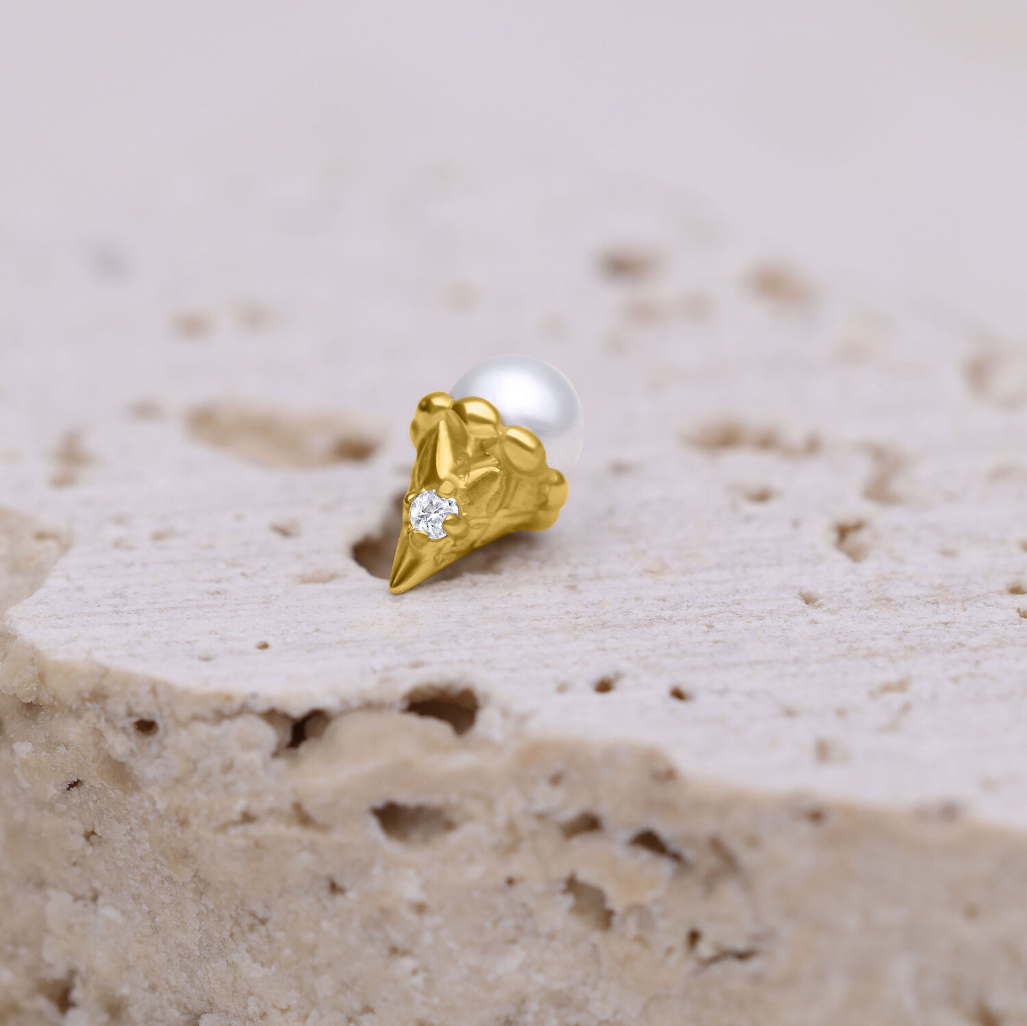 La forma de cucurucho de helado, rematada con una elegante perla y un cristal discretamente brillante, aporta un toque moderno y lujoso que realza cualquier piercing.