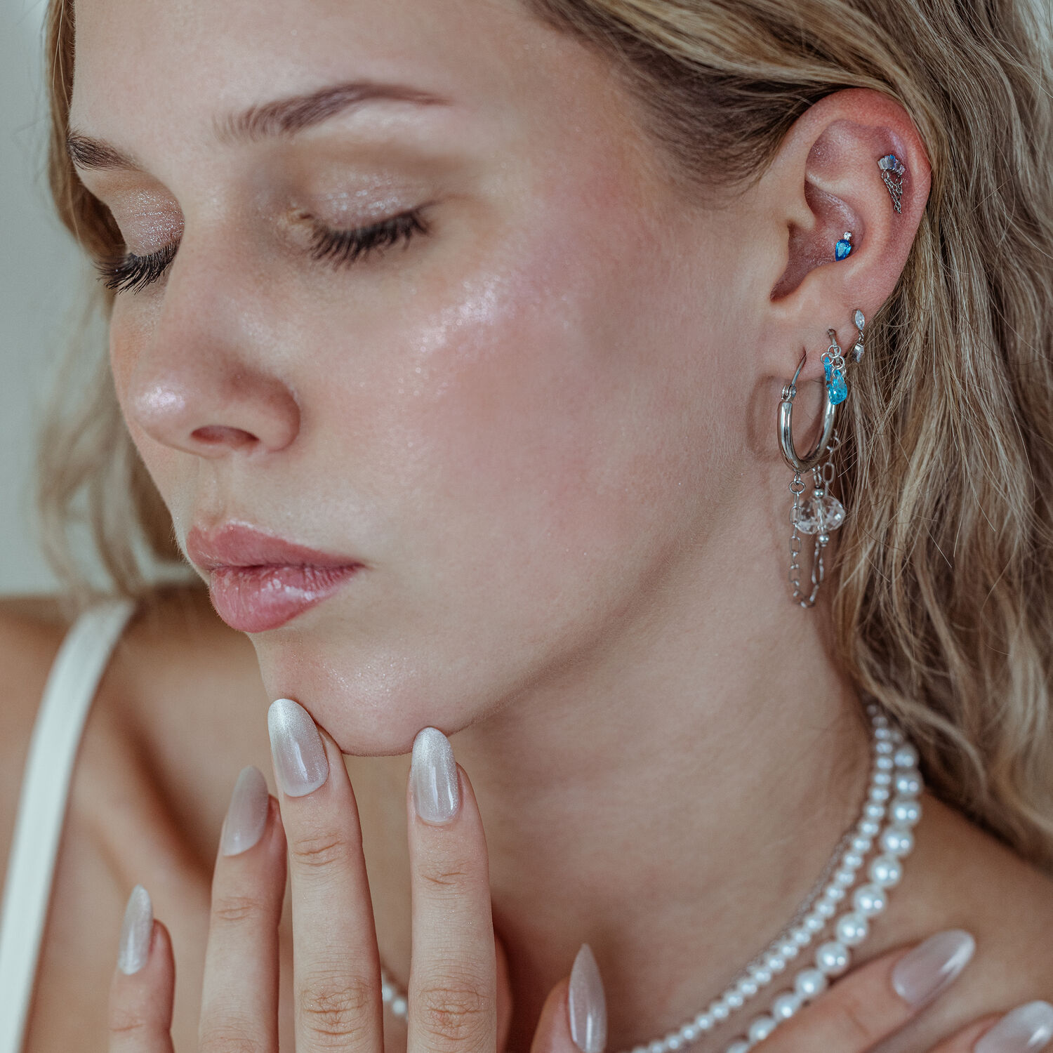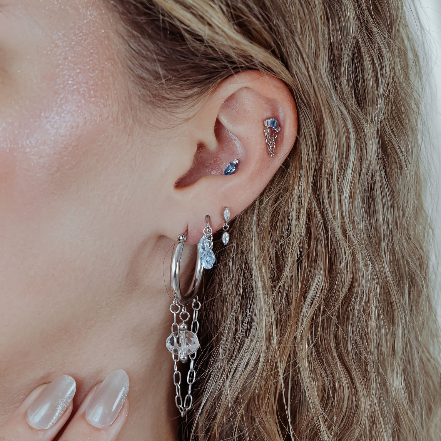 Los cristales brillantes en turquesa y lavanda relucen como pequeños tesoros, captando la luz con cada movimiento y haciendo que tu piercing brille. Combinado con plata refinada o oro lujoso, crea un diseño que llama la atención al instante y aporta a tu look una elegancia irresistible.