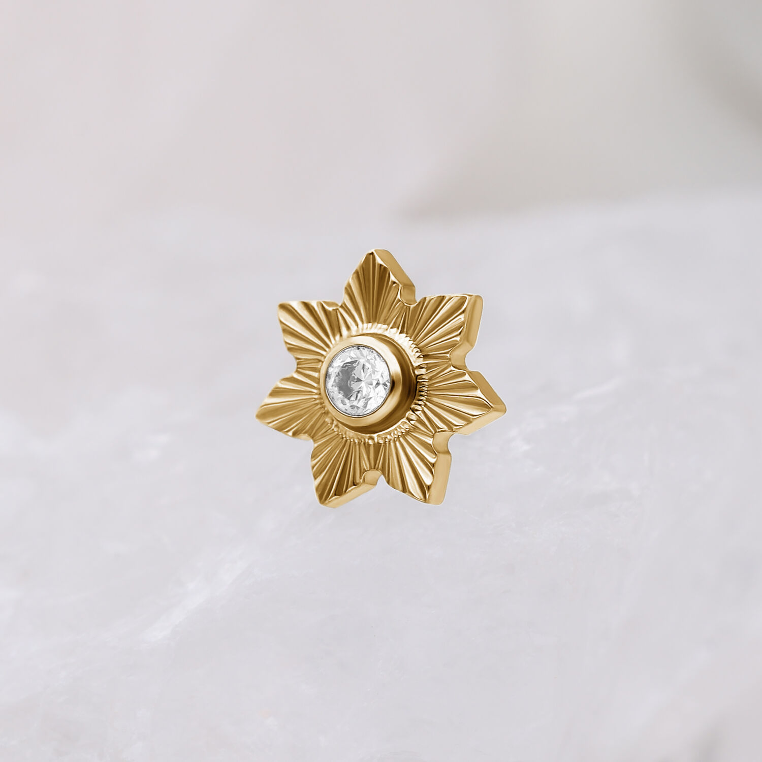El Riffled Winter Jasmine Attachment aporta a tu piercing un toque elegante con inspiración invernal. El fino diseño de flor estriada recuerda a un jazmín helado y crea un suave y sofisticado destello con la luz. Fabricado en titanio de alta calidad grado 23 (G23), el accesorio ofrece excelente compatibilidad con la piel y es ideal para el uso diario.