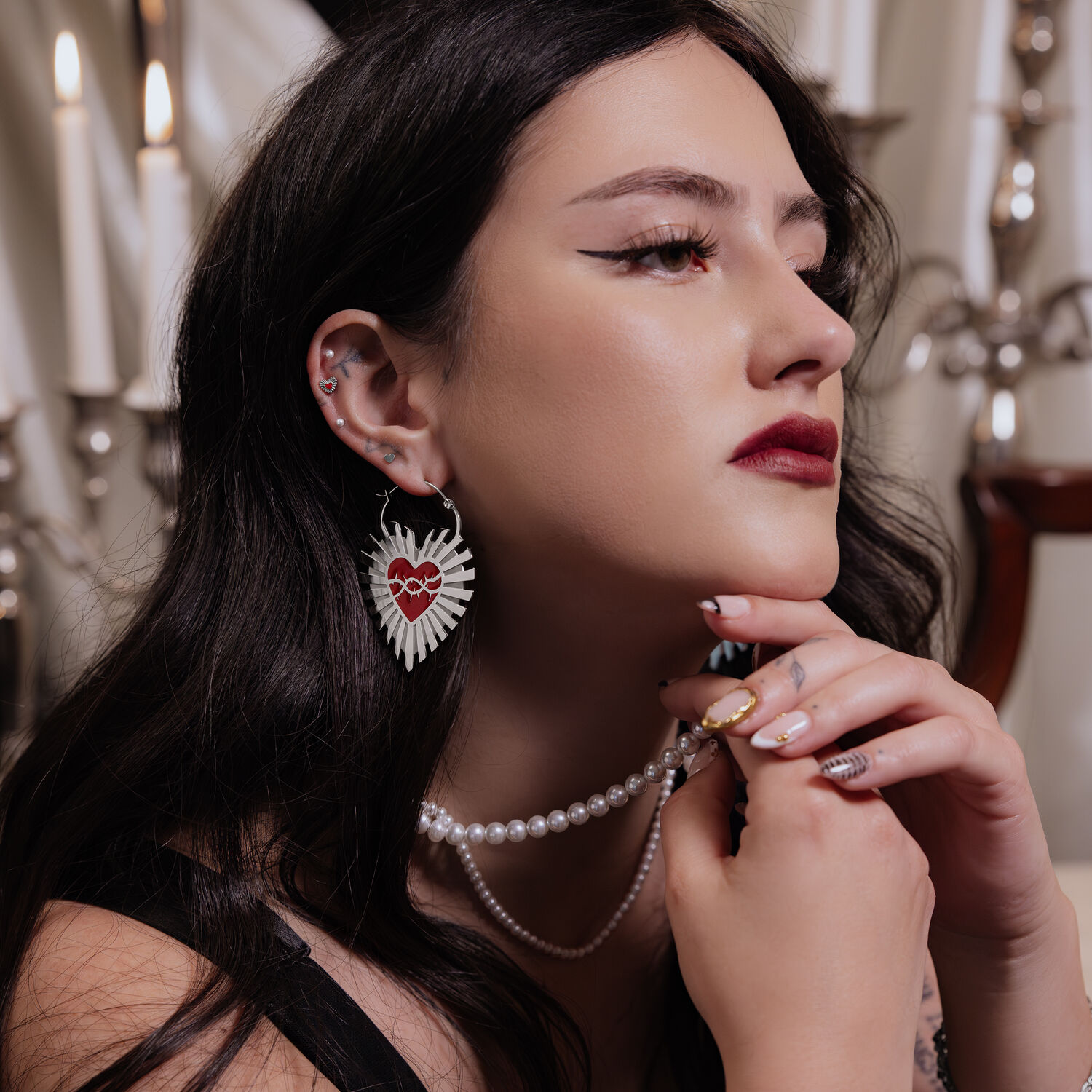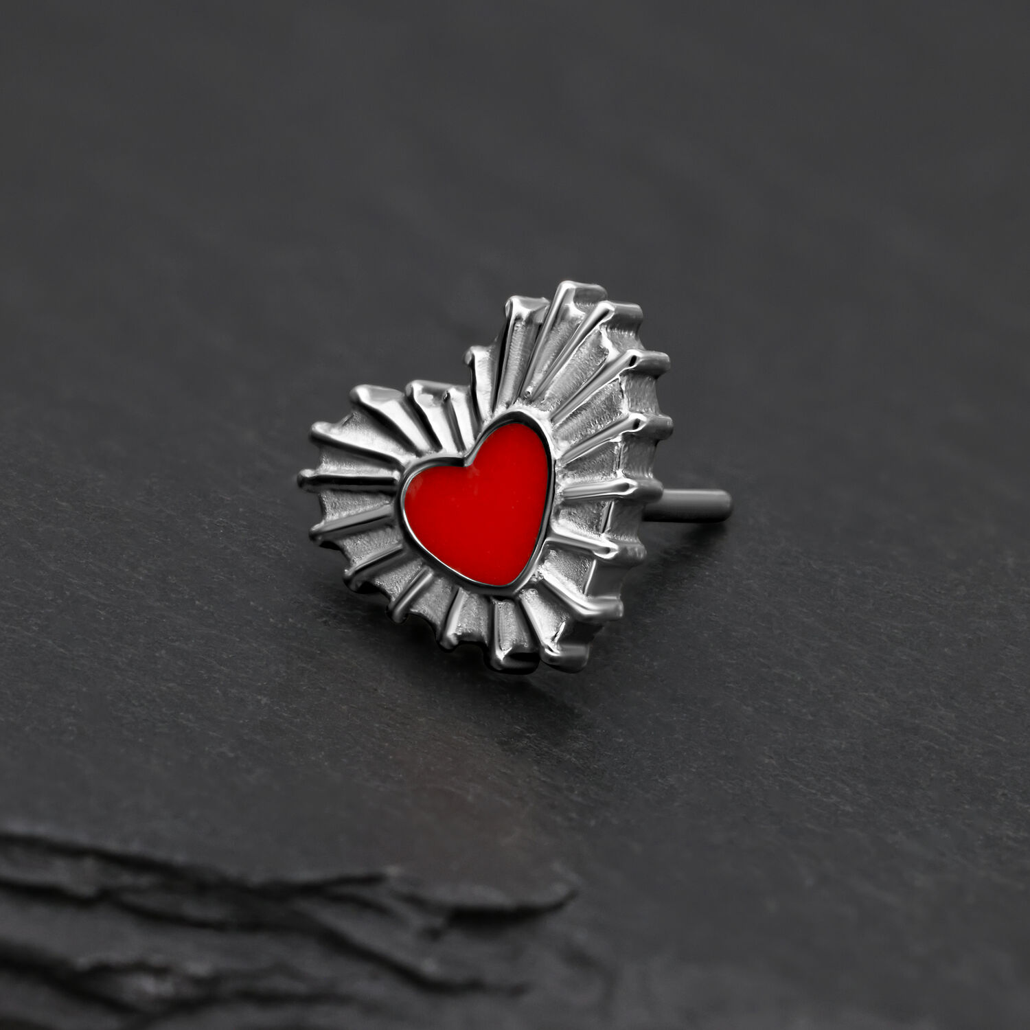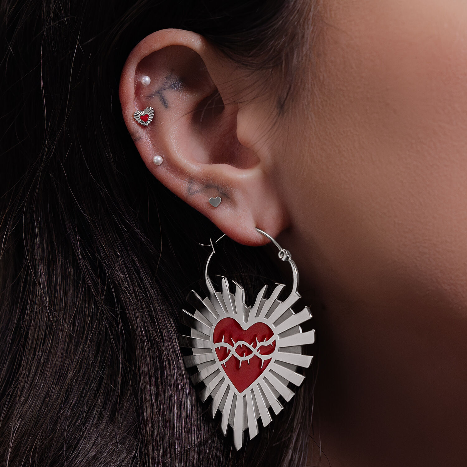 Este accesorio único con diseño Sacred Heart combina profundidad espiritual con estética moderna. El icónico corazón en rojo brillante está enmarcado por una forma radiante, símbolo de amor, entrega y fuerza silenciosa.