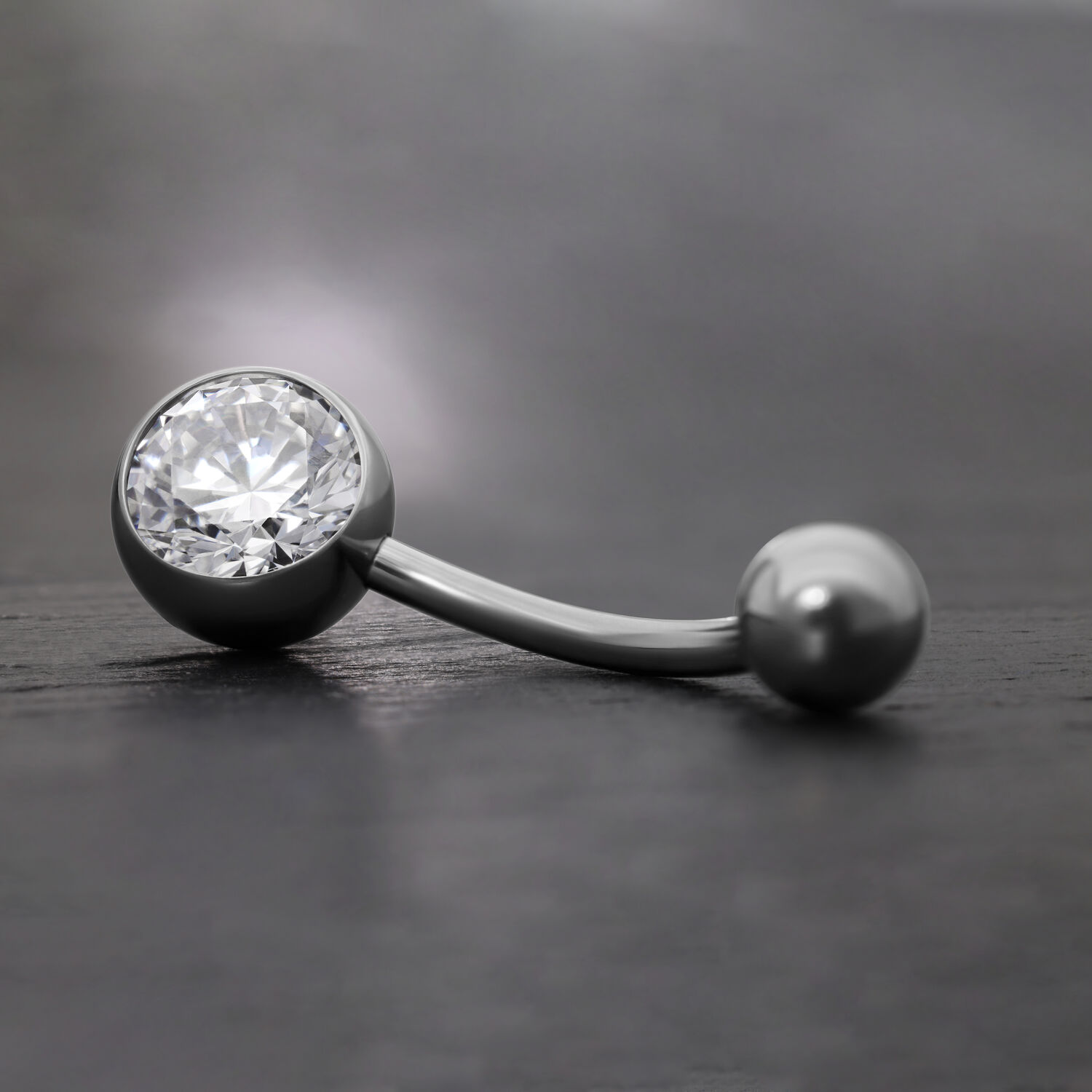 El BYCG Jewelled Bananabell con una barra de 1,6 mm de grosor está disponible en longitudes de 10,0 mm y 12,0 mm, e incluye una bola grande (8,0 mm) y una bola pequeña (5,0 mm). La bola grande está adornada con un elegante cristal. Este piercing está disponible en los colores de cristal Crystal Clear, Fancy Champagne, Fancy Morganite y Greyish Blue.
