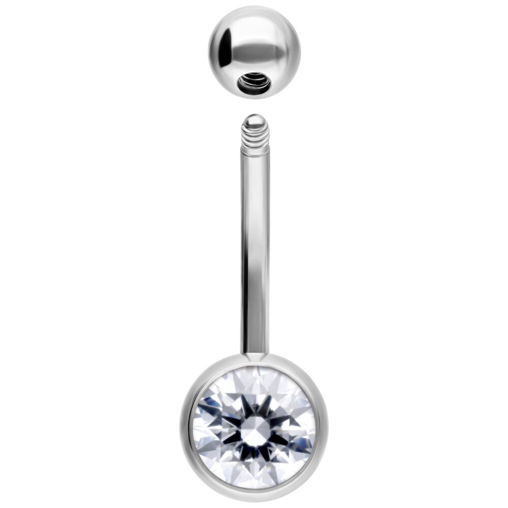 El BYCG Jewelled Bananabell con una barra de 1,6 mm de grosor está disponible en longitudes de 10,0 mm y 12,0 mm, e incluye una bola grande (8,0 mm) y una bola pequeña (5,0 mm). La bola grande está adornada con un elegante cristal. Este piercing está disponible en los colores de cristal Crystal Clear, Fancy Champagne, Fancy Morganite y Greyish Blue.