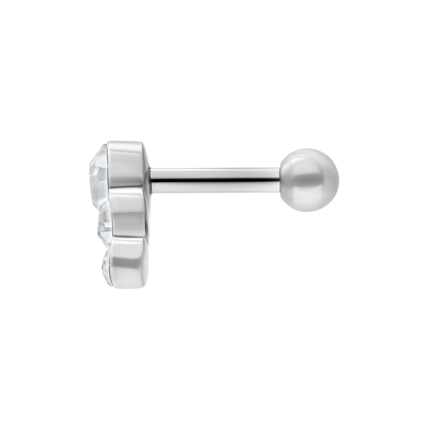 Esta barra para oreja con cinco cristales claros engastados y acabado pulido hace que tu oreja brille de verdad. El tamaño del diseño es de 14,0 x 6,0 mm. La bola trasera mide 3,0 mm, tiene rosca interna y se puede enroscar fácilmente en la barra con rosca externa.
