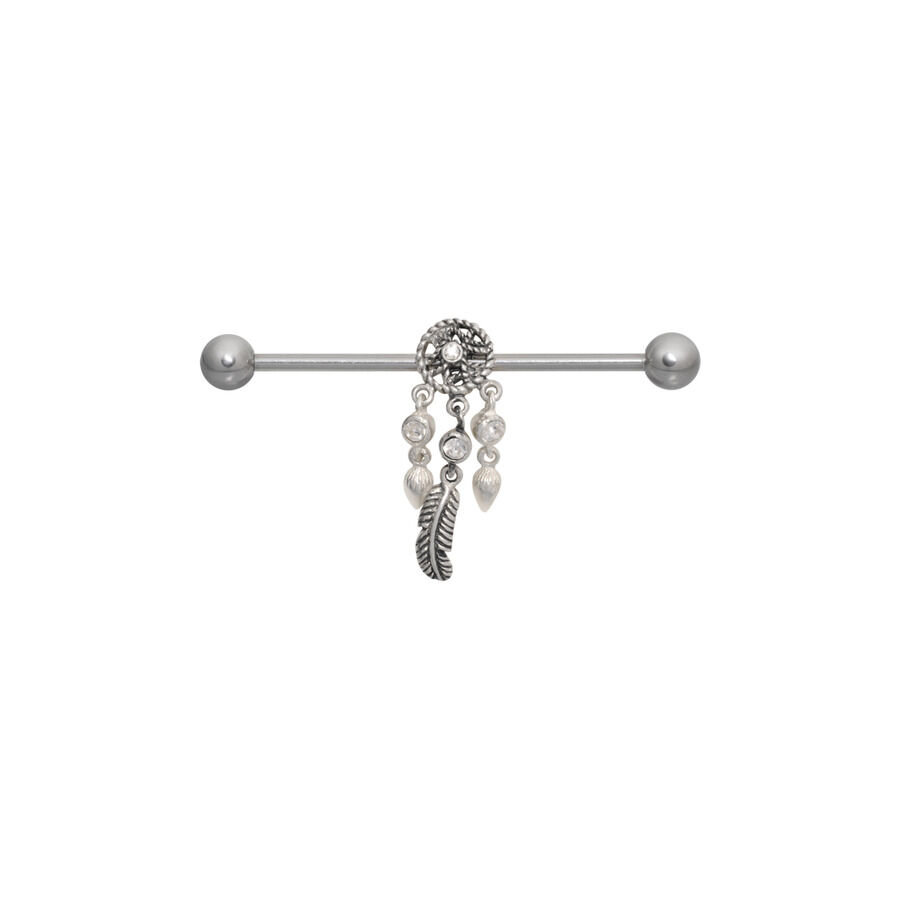 Este precioso industrial tiene un estilo súper original y lleno de detalle. Es una pieza divertida y con mucha personalidad, un auténtico must-have. En el centro del piercing hay un elemento móvil con forma de atrapasueños, decorado con un pequeño cristal blanco en el medio. De él cuelgan tres cristales más, junto a una pluma y dos adornos adicionales.