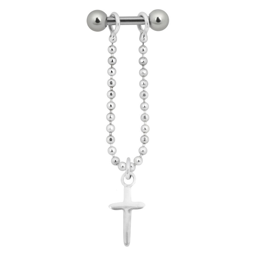 Micro Barbell con cruz colgante. Este colgante para la oreja es una alternativa genial a los Ear Cuffs/Ohrklemmen para orejas perforadas. El Mini-Barbell con cadena y colgante es perfecto para tu Helix. La barra tiene un grosor de 1.2 mm y una longitud de 6 mm. La cadena con colgante mide 13.5 mm. Las bolas son desmontables en ambos extremos.