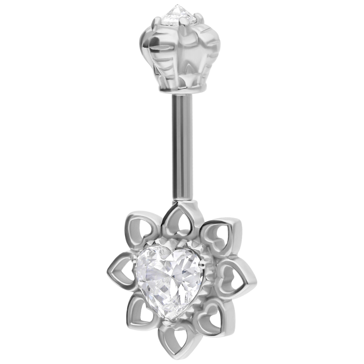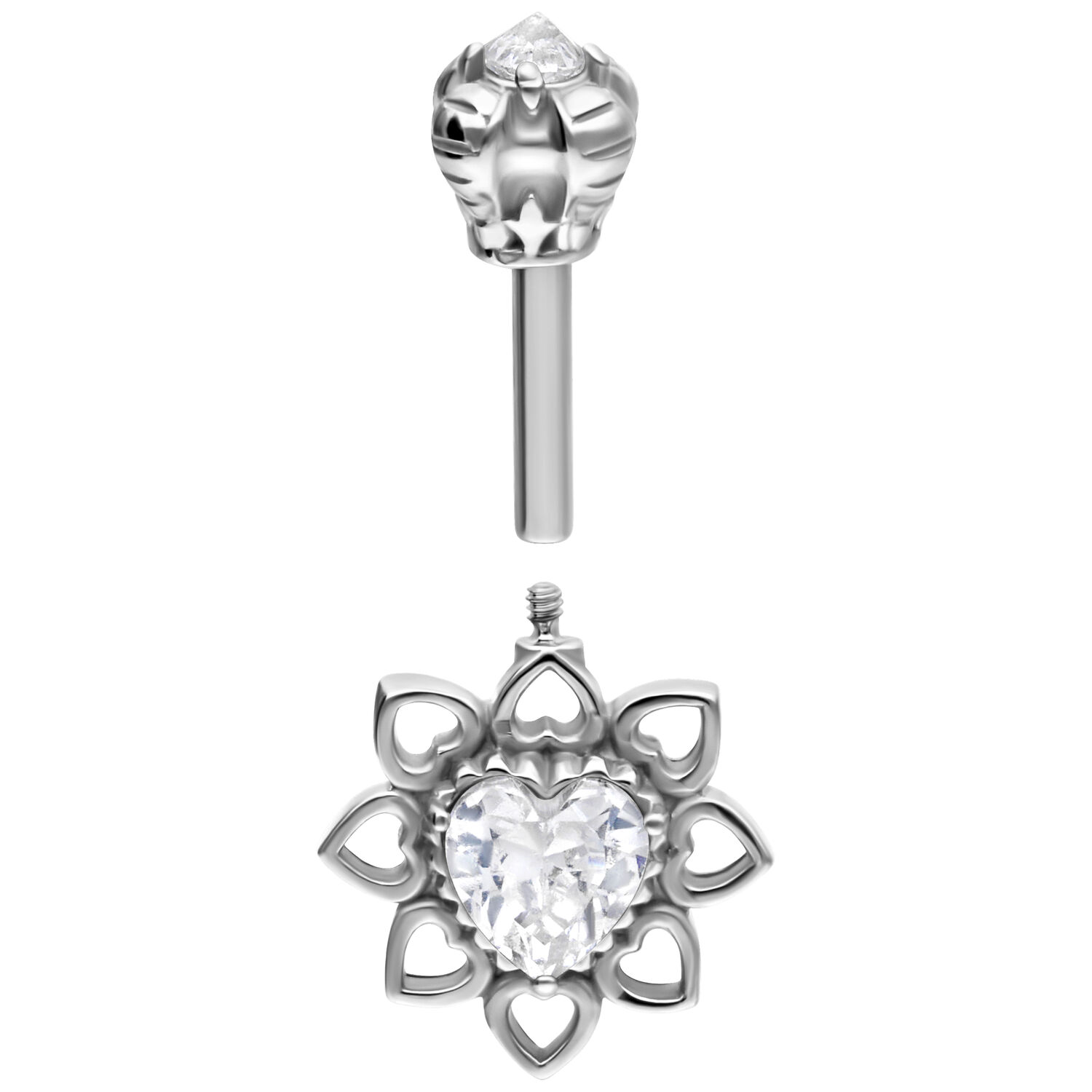 Esta joya de piercing para la hélice vertical, diseñada con esmero, encanta con un diseño juguetón en forma de corazón. La pieza central es una brillante circonita en forma de corazón rodeada de una flor de filigrana con pequeños elementos de corazón abiertos: un símbolo de amor, elegancia e individualidad. El enganche superior con rosca interior está hábilmente elaborado y recuerda a una corona floral: perfecto para quien aprecie los detalles románticos.