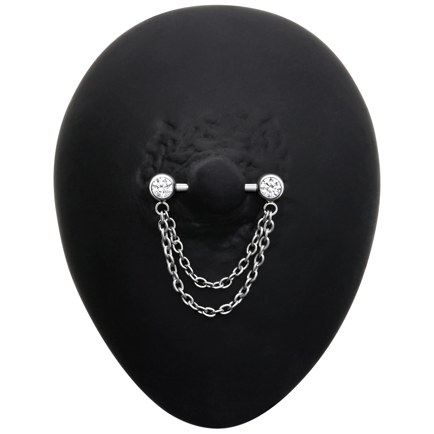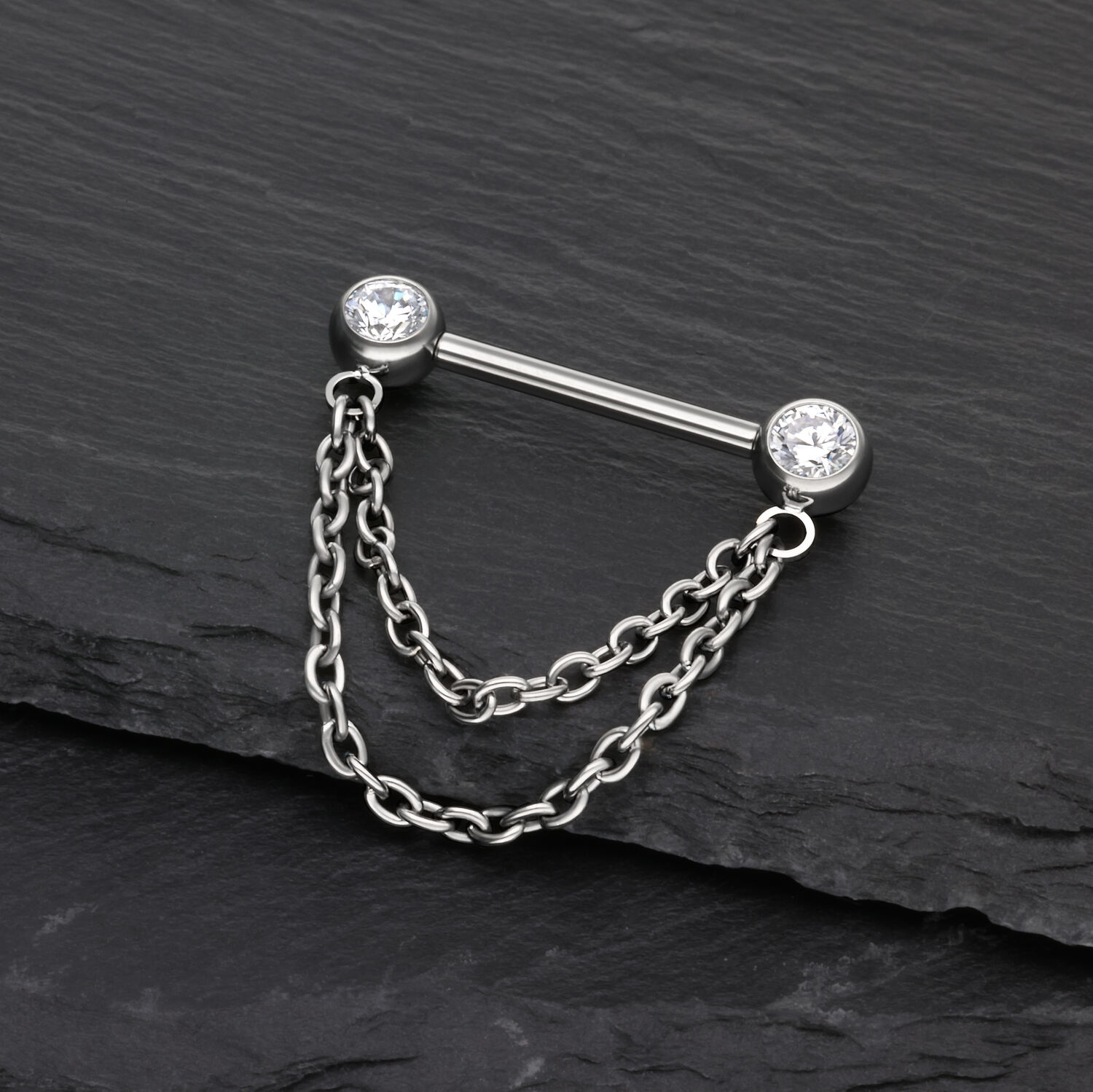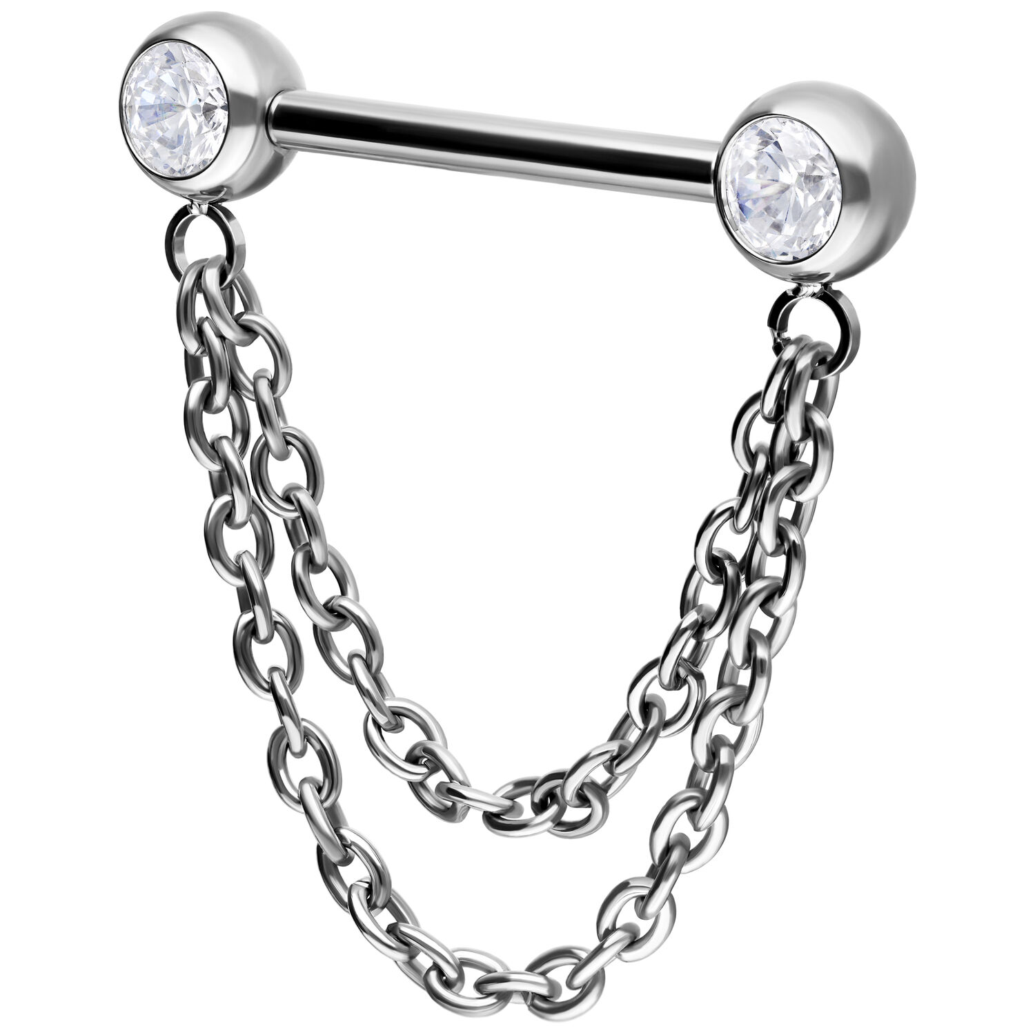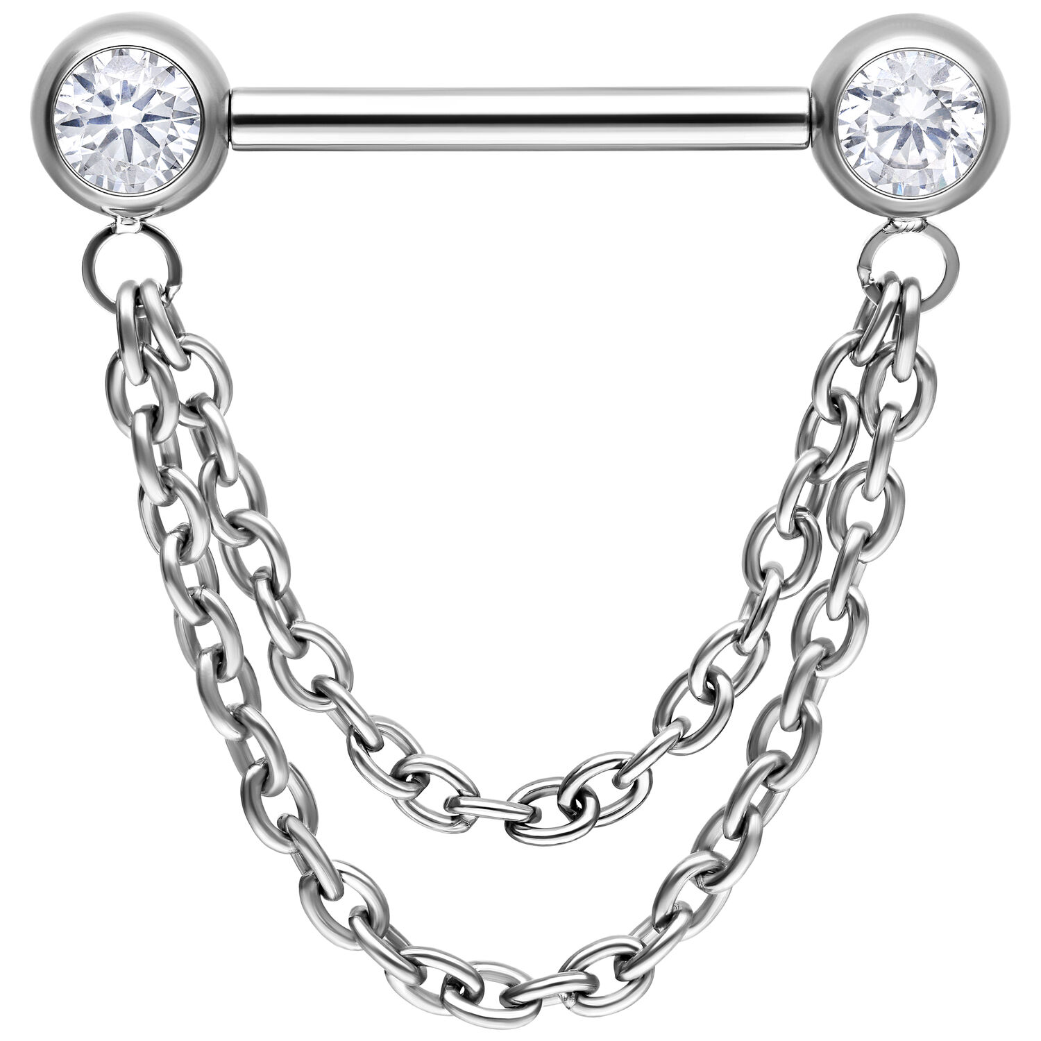 El piercing forma parte de nuestra colección Titanium Basicline y está fabricado en titanio de alta calidad. Llaman especialmente la atención los dos cristales redondos engastados, que brillan maravillosamente con la luz, y las finas cadenas, que se balancean suavemente con cada movimiento.