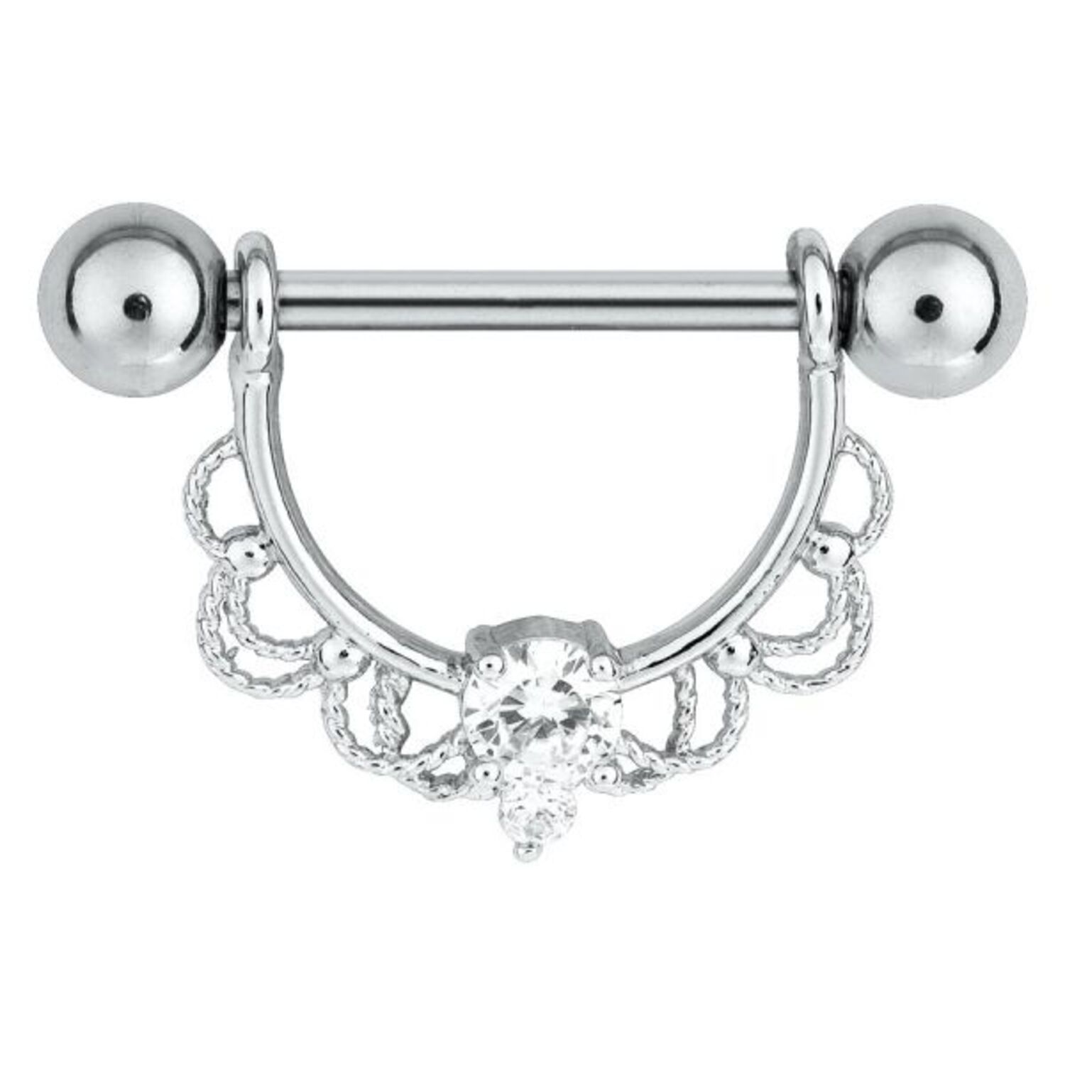El místico Nipple Barbell con escudo para tu pezón está compuesto por dos partes. El barbell, hecho de acero inoxidable 316L, tiene una longitud total de 14 mm, aunque, al enganchar el escudo, la longitud total es de 12 mm. Los ojales por los que se introduce el barbell tienen una distancia fija. El escudo está formado por un diseño delicado.