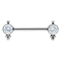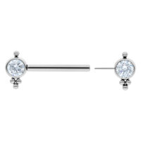Un adorno de cristal se puede poner y quitar fácilmente, lo que permite una colocación muy simple. El barra se puede insertar fácilmente a través del pezón y cerrarse por el otro lado.
