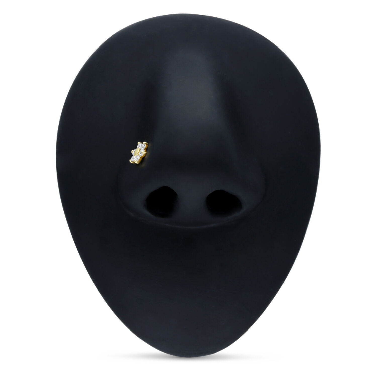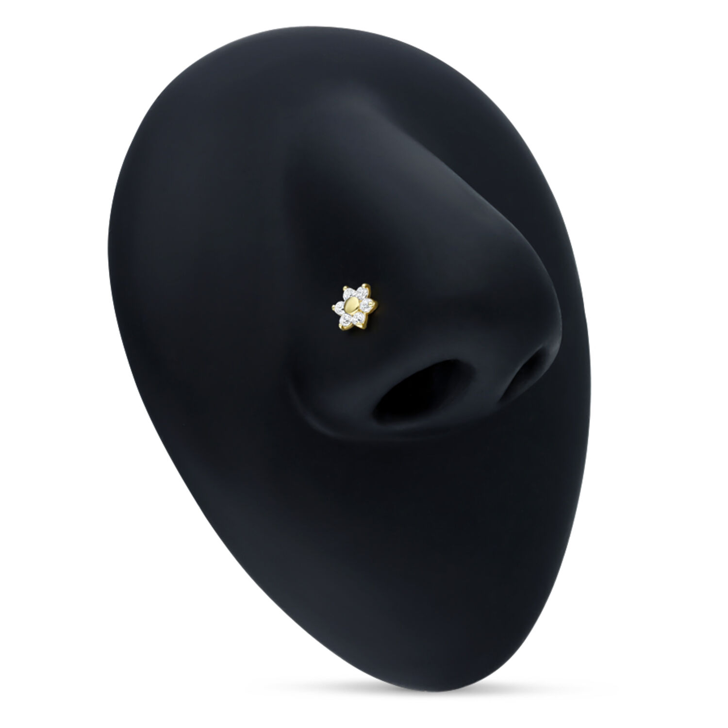Este exclusivo piercing nasal de 18 quilates ha sido forjado con el oro amarillo más fino y adornado con un brillante cristal blanco en forma de flor, que te hará resplandecer incluso a la distancia.