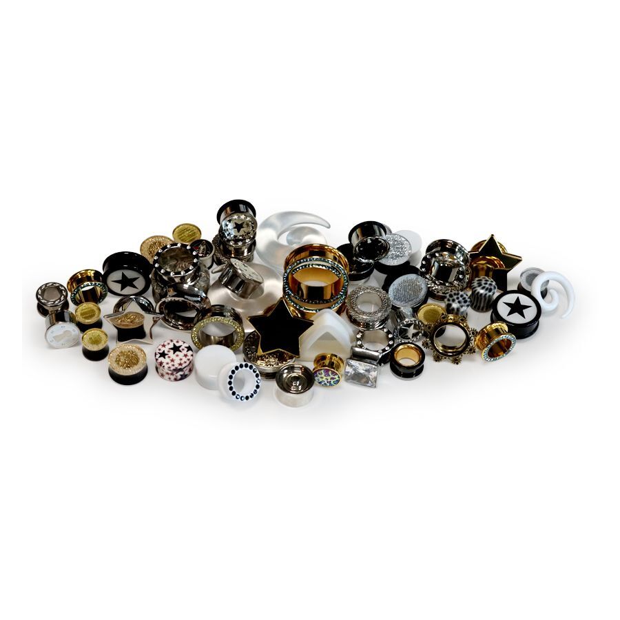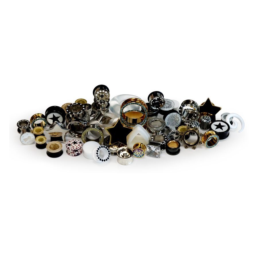 El “Winter Wonderland Set” consta de 56 plugs, túneles y espirales de dilatación, hechos de diversos materiales como acero inoxidable, acrílico, silicona, madera, titanio, piedra y PMMA.