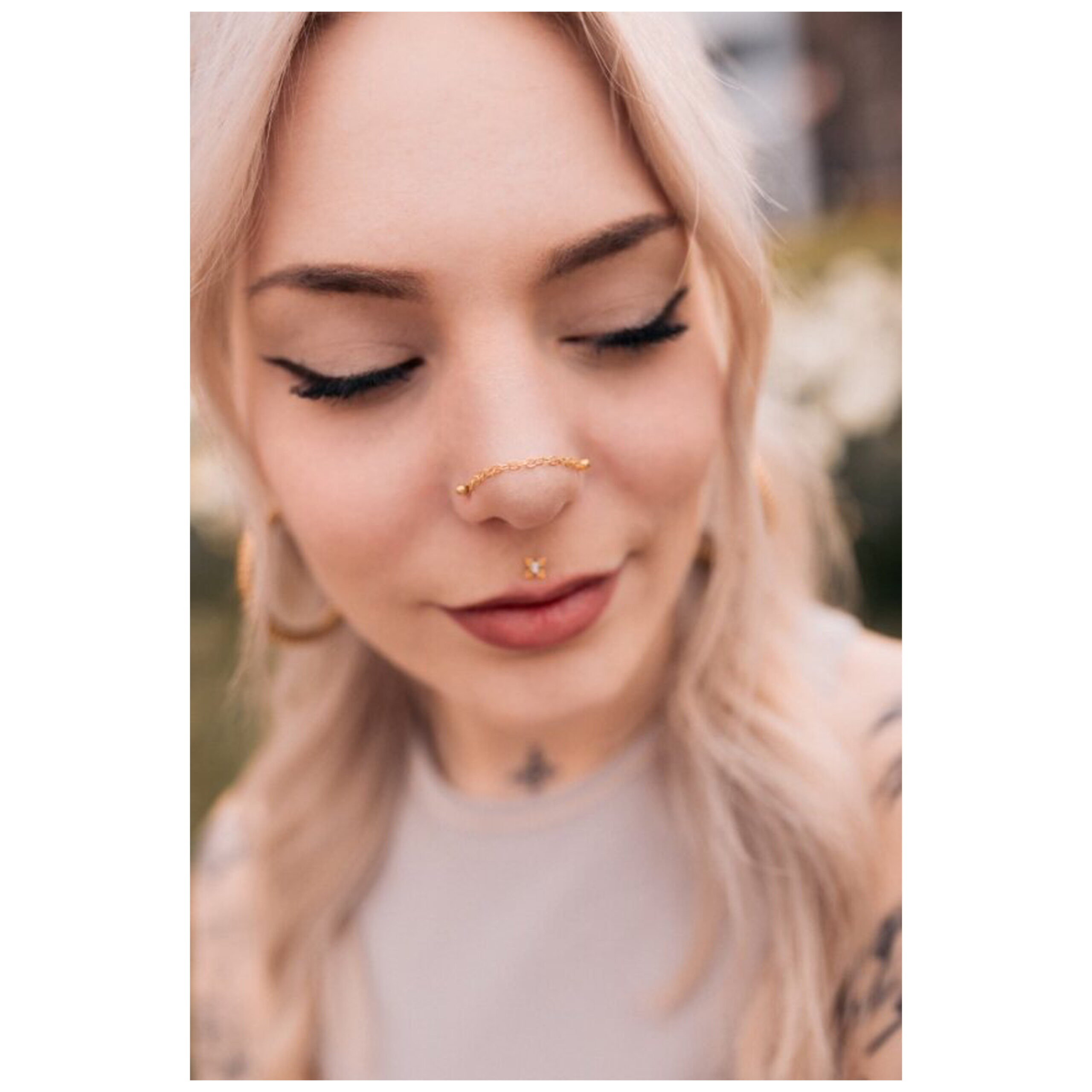 Con nuestras Piercing Connection Chains puedes llevar tu estilo de piercings a otro nivel. Sé creativo y conecta las cadenas, por ejemplo, con tus piercings de nariz, tus piercings de oreja, o úsalas en la parte delantera y trasera de piercings individuales. Puedes usar las cadenas con todas las barras y anillos de hasta 1,6 mm de grosor. Para ello, abre tu anillo o desenrosca las bolas/accesorios de los piercings que quieras conectar, pasa los aros de conexión de la cadena y vuelve a colocar tus bolas/accesorios.