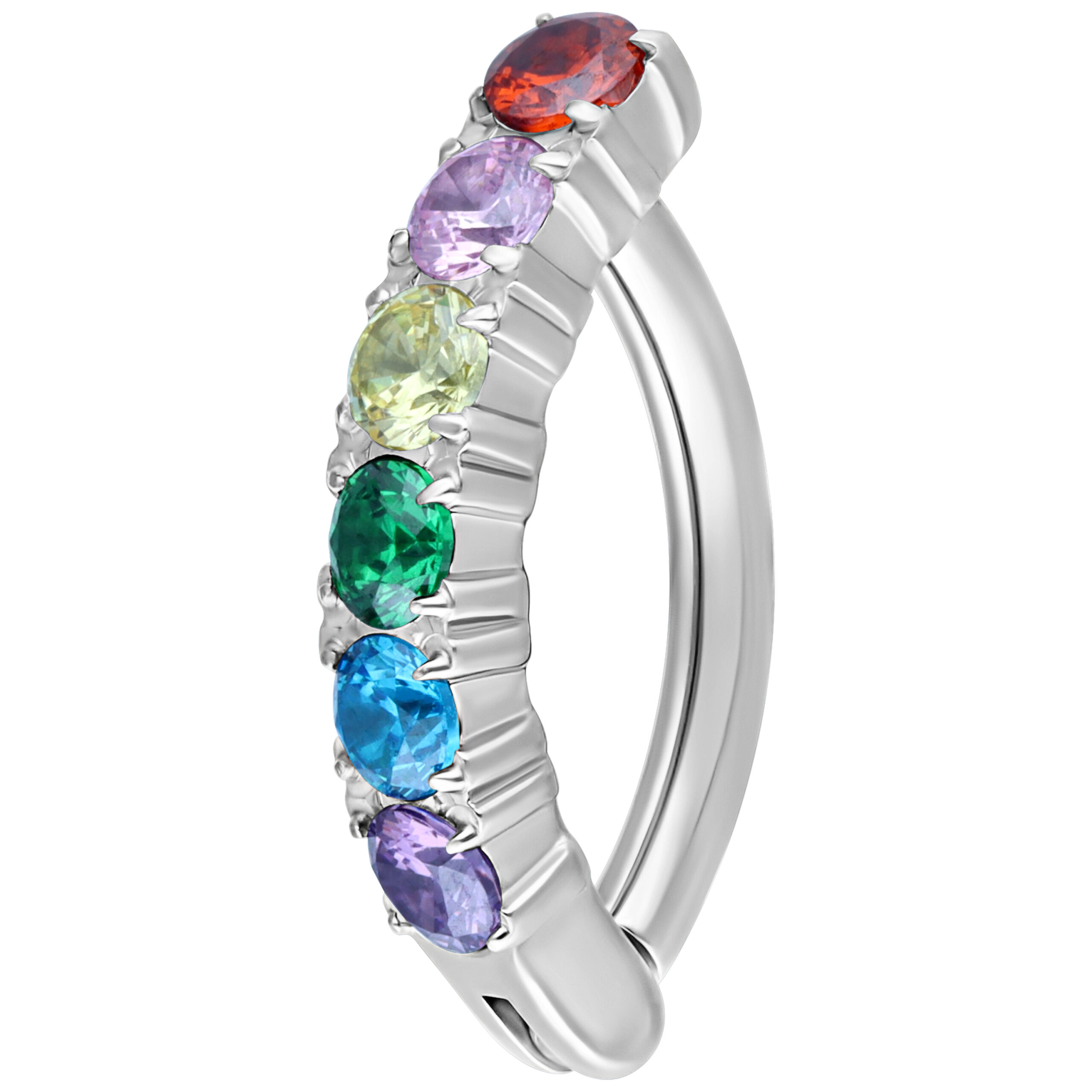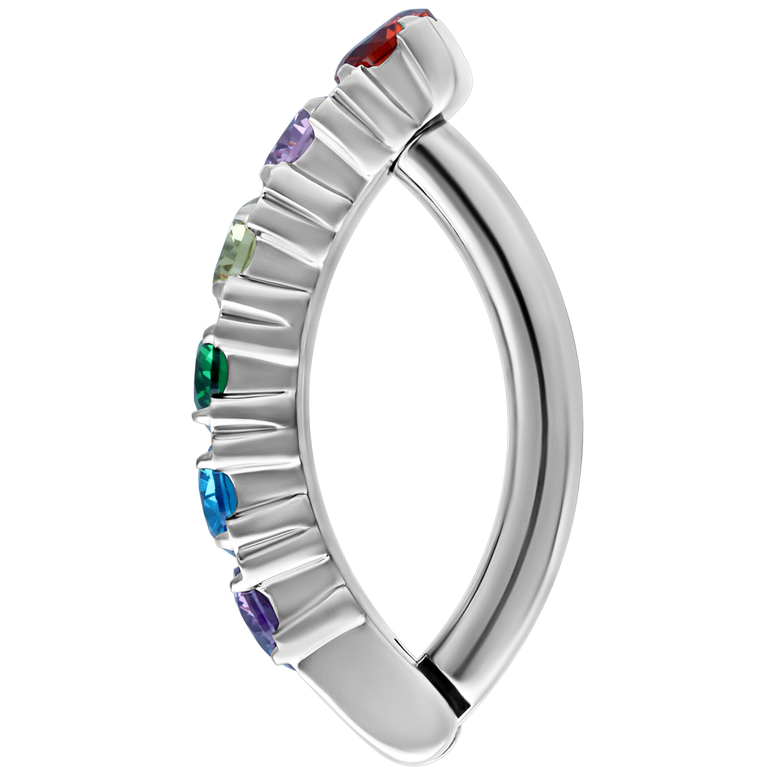 El Rainbow Crystal Belly Arch Clicker está fabricado con titanio de alta calidad y adornado con hermosos cristales en colores de arcoíris. Los cristales multicolores simbolizan alegría, diversidad y positividad. Este piercing es un verdadero centro de atención y le da a tu estilo un toque alegre y juguetón. Lo puedes obtener en titanio color plata, oro o rosado, con piedras preciosas cristalinas. Gracias al mecanismo de clic, se garantiza una colocación sencilla y respetuosa con la piel.