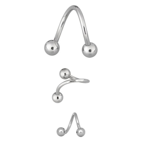 La espiral está disponible en un grosor de 1,2 mm con un diámetro interior de 8,0 mm y dos bolas de 4,0 mm. En el grosor de 1,6 mm, está disponible con un diámetro interior de 10,0 o 12,0 mm, cada uno con dos bolas de 5,0 mm.