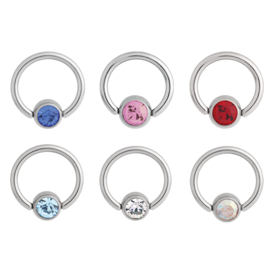 El Flat Back Jewelled Clip in Ring de Titan Highline® con grosor de 1.2 mm y base plana es perfecto para tu piercing en el labio. Está disponible en diámetros de 7.0, 8.0 y 9.0 mm con una bola de sujeción de 4.0 mm incrustada con cristales de alta calidad. Los colores disponibles son Zafiro Azul (SB), Rosa (RS), Rojo (RE), Azul Claro (LB), Crystal Clear (CC) y Aurora Boreale (AB). En Crystal Clear, el anillo también está disponible en titanio negro, dorado o rosé.