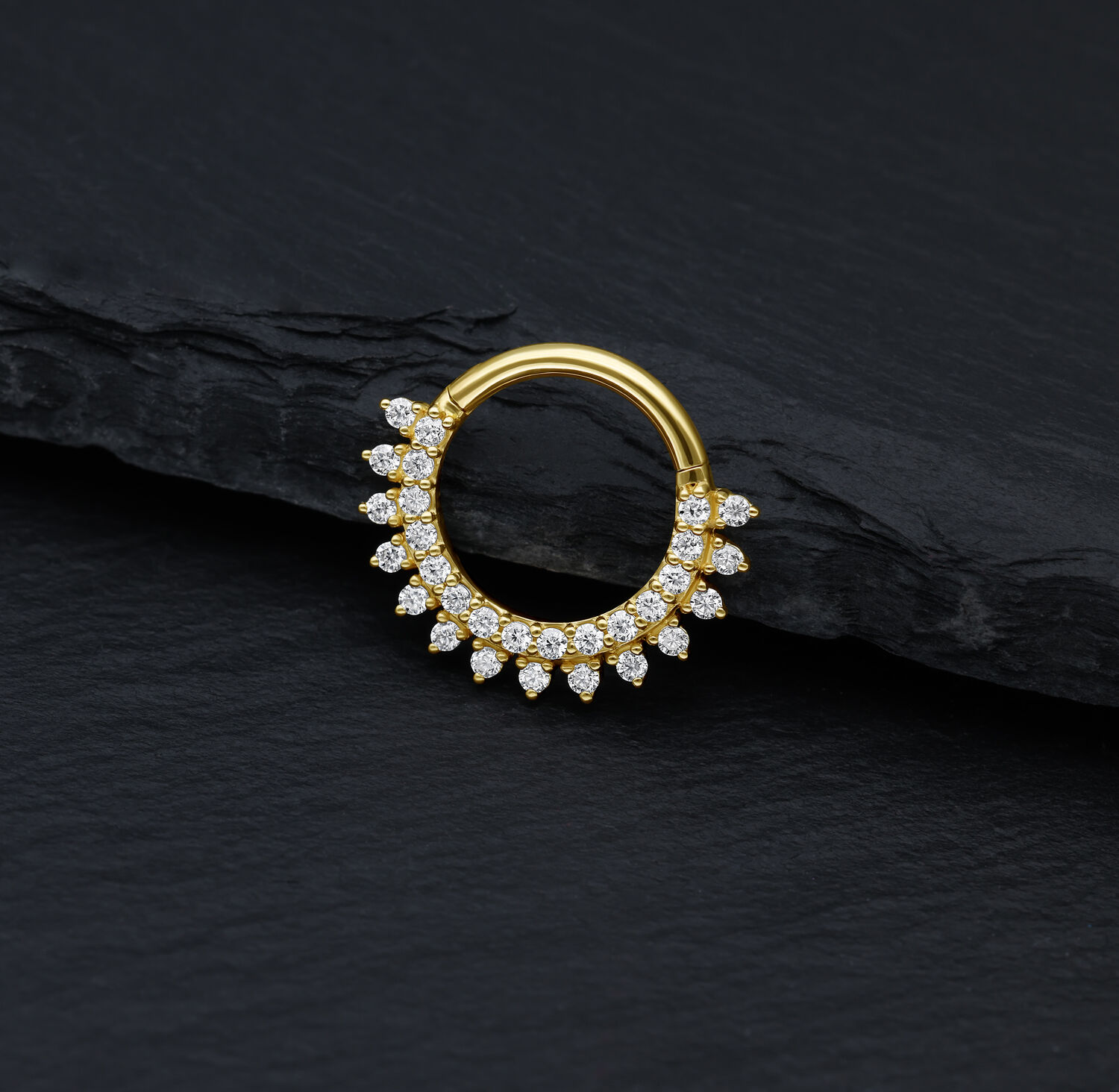 Perfecto para piercings en Helix, Lóbulo o Conch: el diseño delicado aporta toques luminosos y se combina perfectamente con otras piezas de joyería en oro. Ya sea usado solo o en un Earstack, este anillo es una verdadera declaración de lujo.