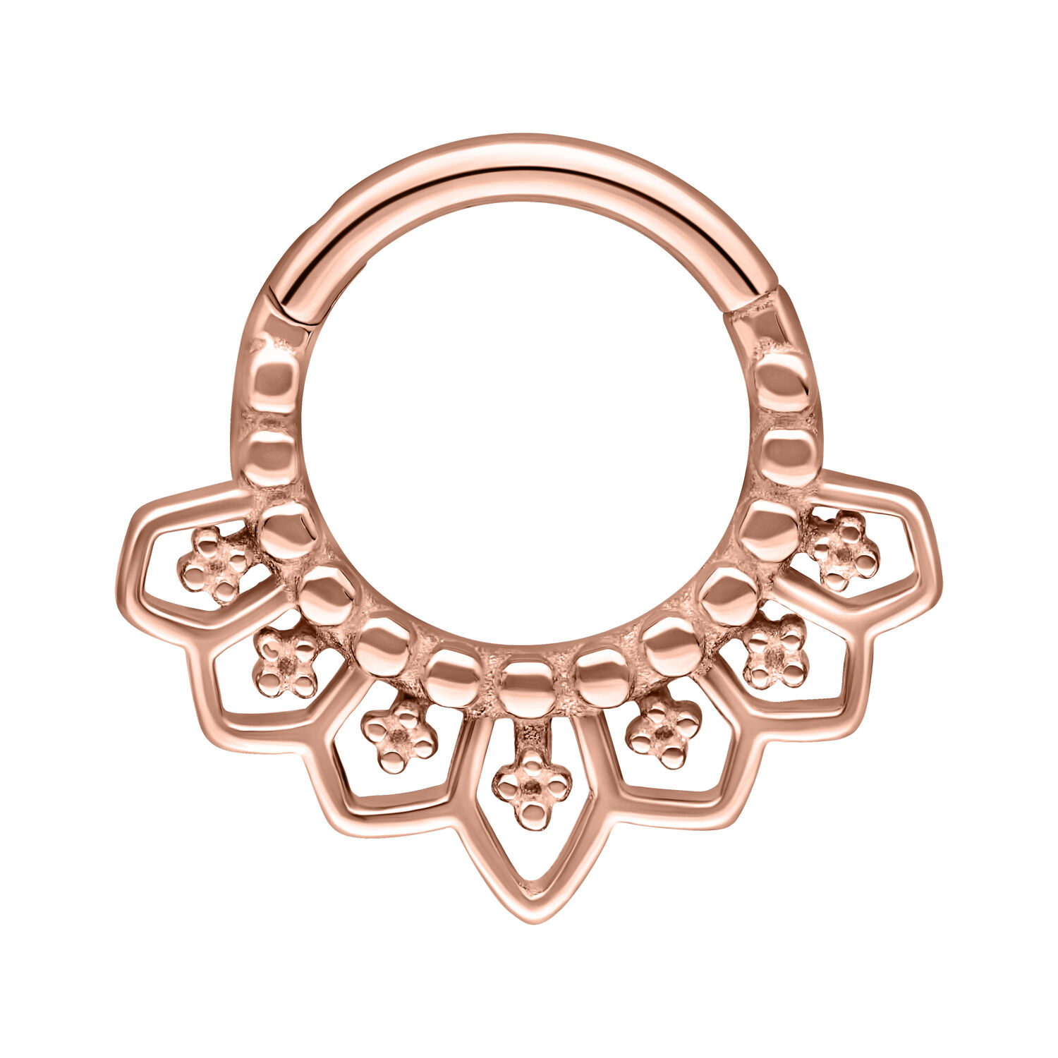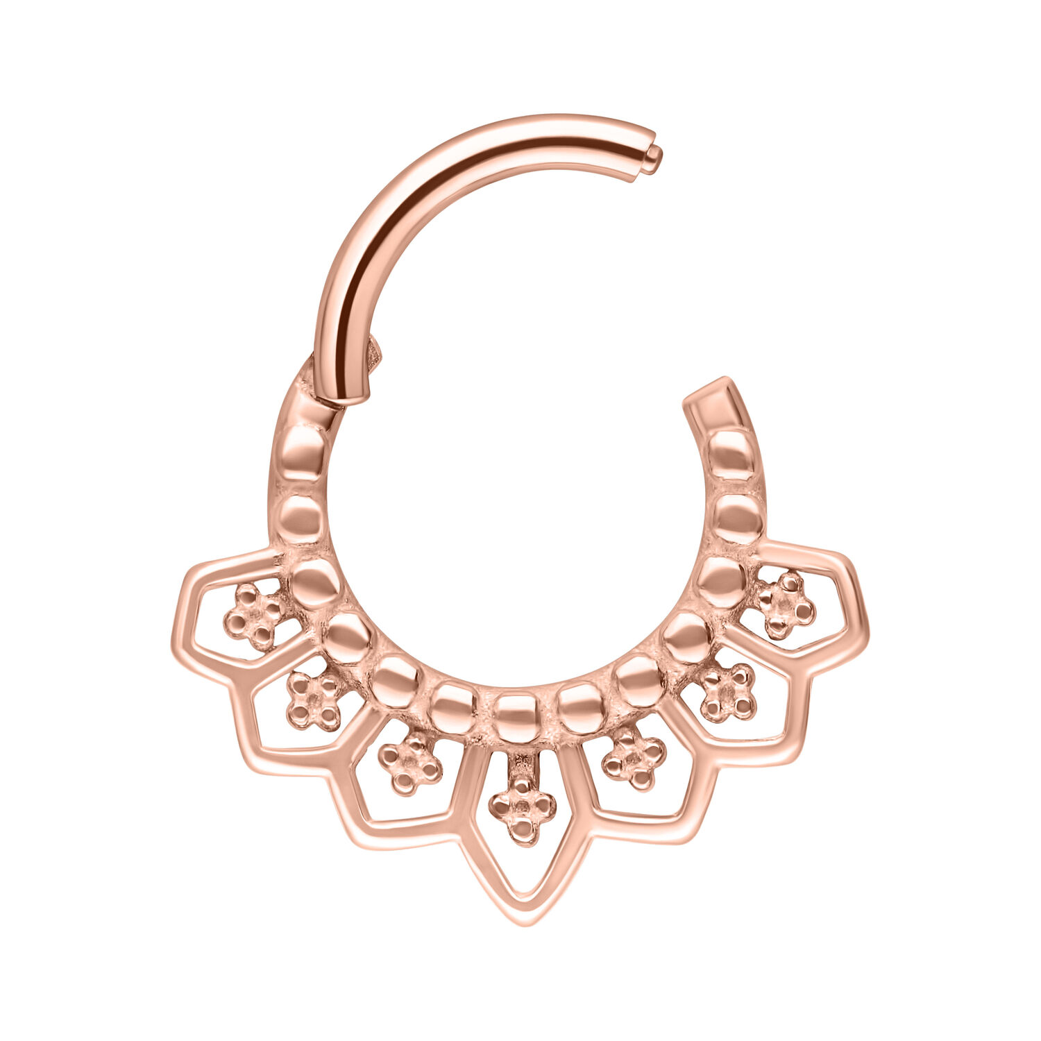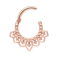 El Cathedral Septum Clicker recuerda a las catedrales de la época gótica y tiene adornos muy elaborados. Deja volar tu creatividad, ya que puedes usar este Aro prácticamente en cualquier piercing. Es especialmente adecuado para tu Septum, Daith o Smiley. Gracias a su cierre abatible, es muy fácil cambiar el piercing sin ayuda.