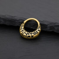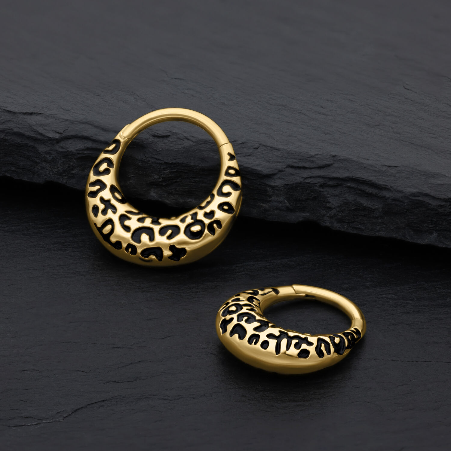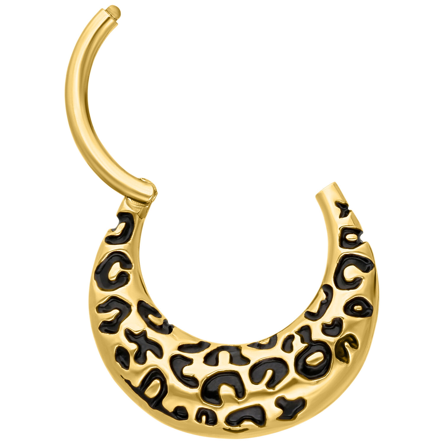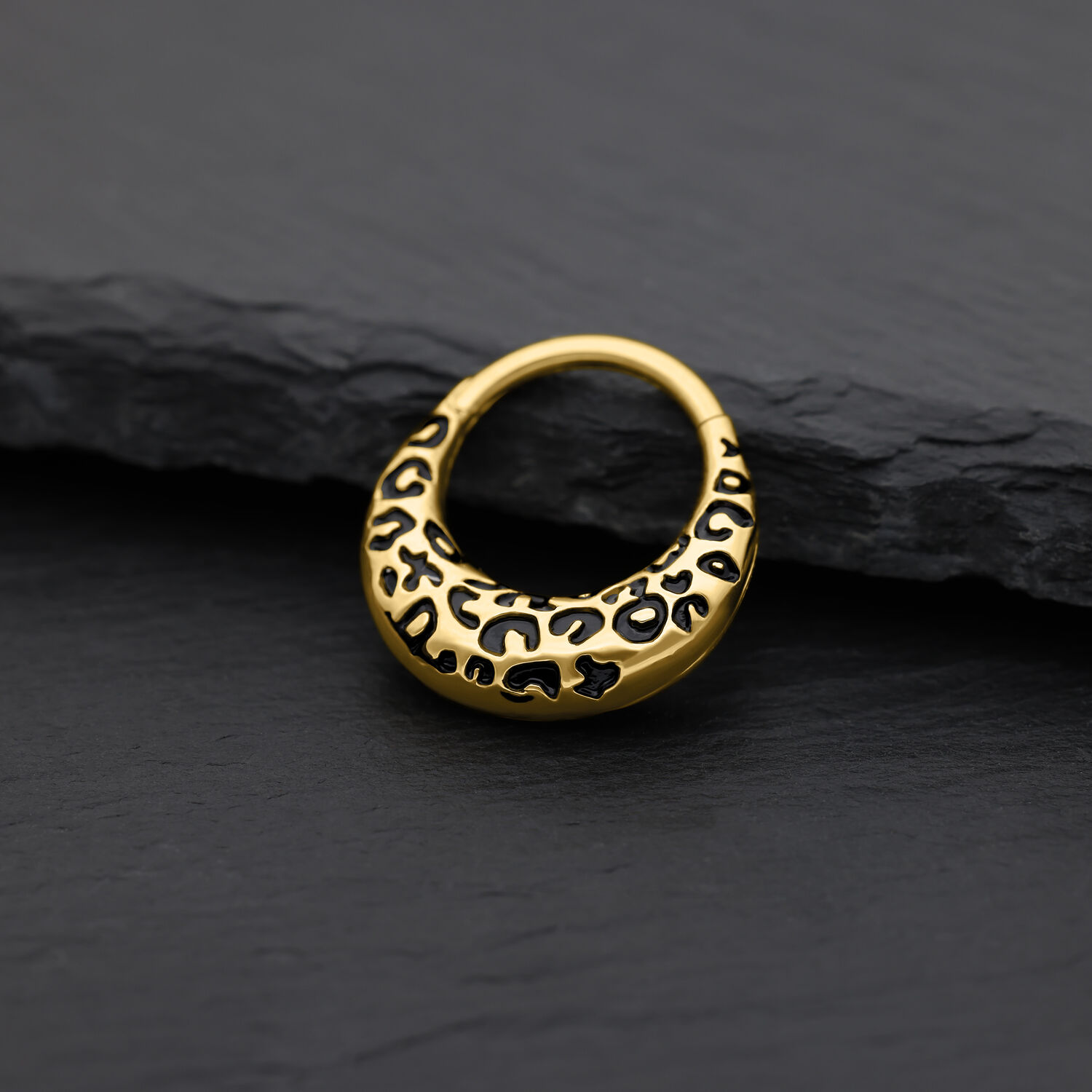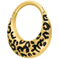 Salvaje, llamativo y totalmente a la moda: el Chunky Leopard Septum Clicker lleva el icónico patrón de leopardo a una forma moderna y elegante. El diseño en esmalte negro intenso combinado con el acabado dorado en titanio aporta a tu look un toque lujoso y rebelde: una pieza que destaca para quienes quieren llamar la atención.