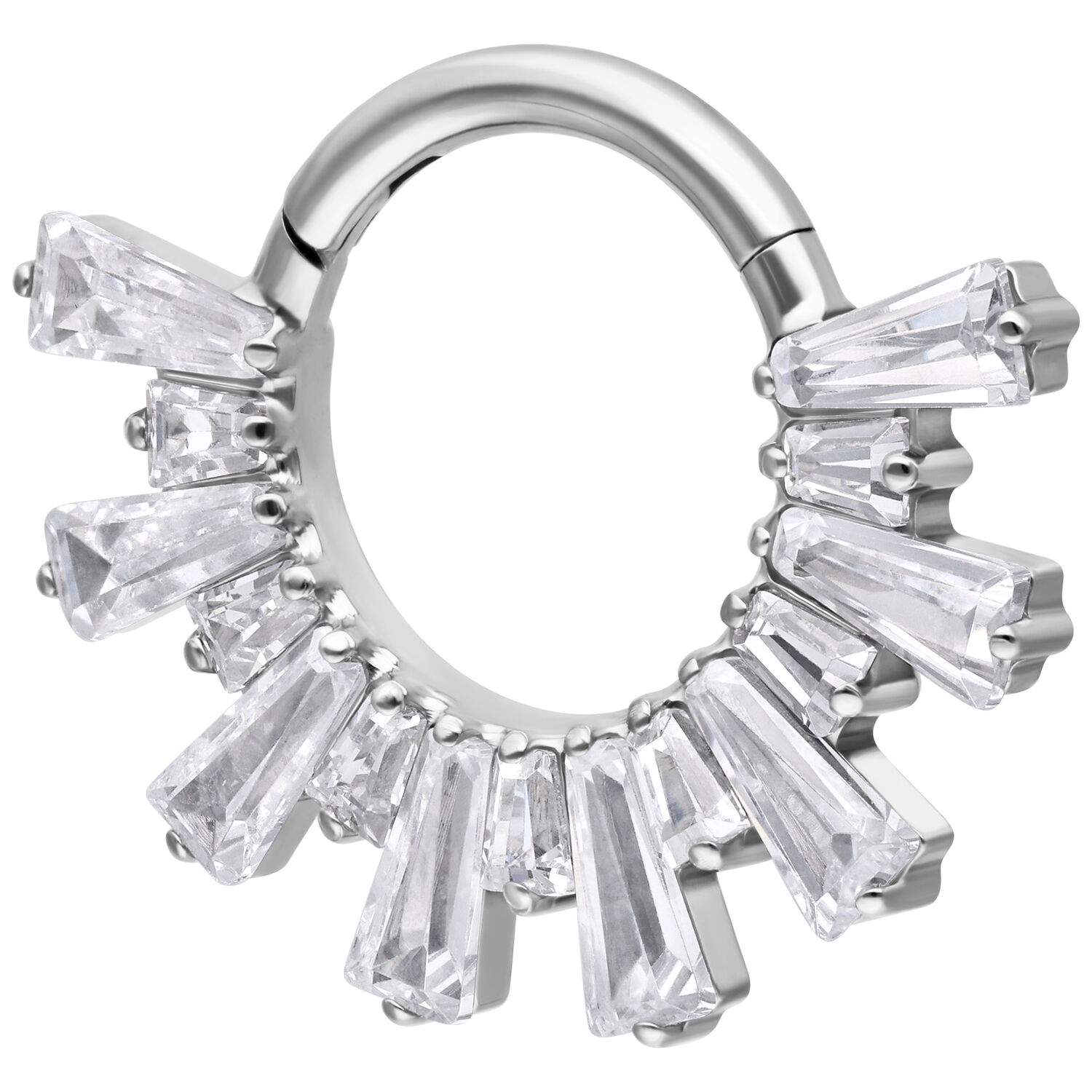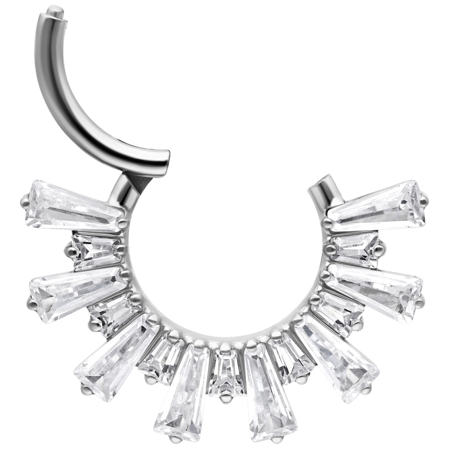 Aro de Septum y Daith Clicker Crystal Sunray de Titanio Grado 23 combina un diseño lujoso con material de alta calidad. Los cristales claros están dispuestos en forma de rayos, creando un elegante efecto Sunray que realza tu piercing con estilo. El acabado preciso asegura una apariencia armoniosa con un toque moderno y premium.