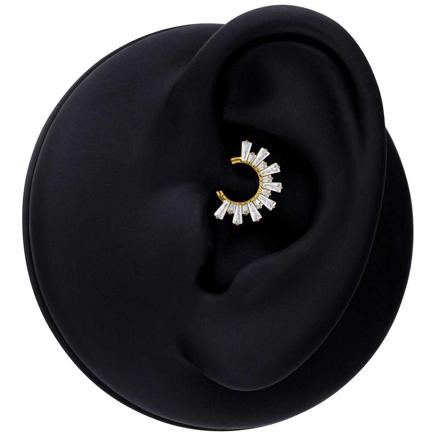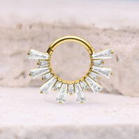 Aro de Septum y Daith Clicker Crystal Sunray de Titanio Grado 23 combina un diseño lujoso con material de alta calidad. Los cristales claros están dispuestos en forma de rayos, creando un elegante efecto Sunray que realza tu piercing con estilo. El acabado preciso asegura una apariencia armoniosa con un toque moderno y premium.
