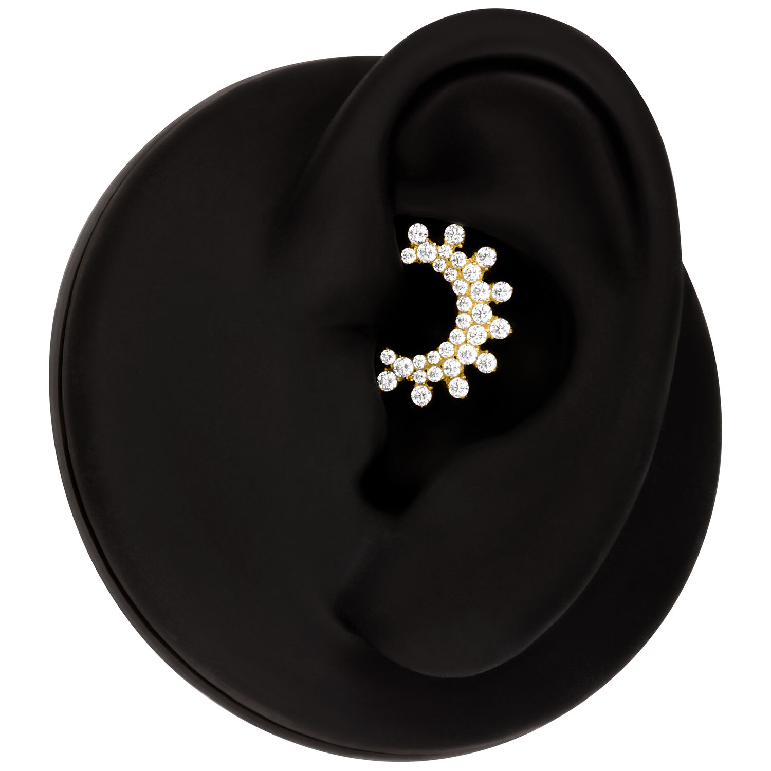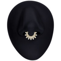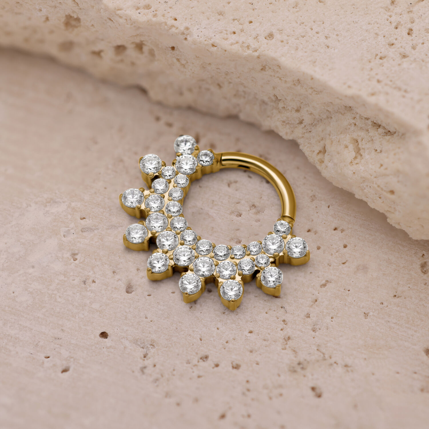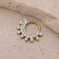 Aro de Septum y Daith Clicker Divine Crystal de Titanio Grado 23 es una pieza llamativa para quienes aman el piercing con mucho estilo. Una gran cantidad de cristales claros brillantes ofrece máxima luminosidad y un look lujoso que no pasa desapercibido. El diseño opulento le da al piercing una presencia expresiva y glamourosa.