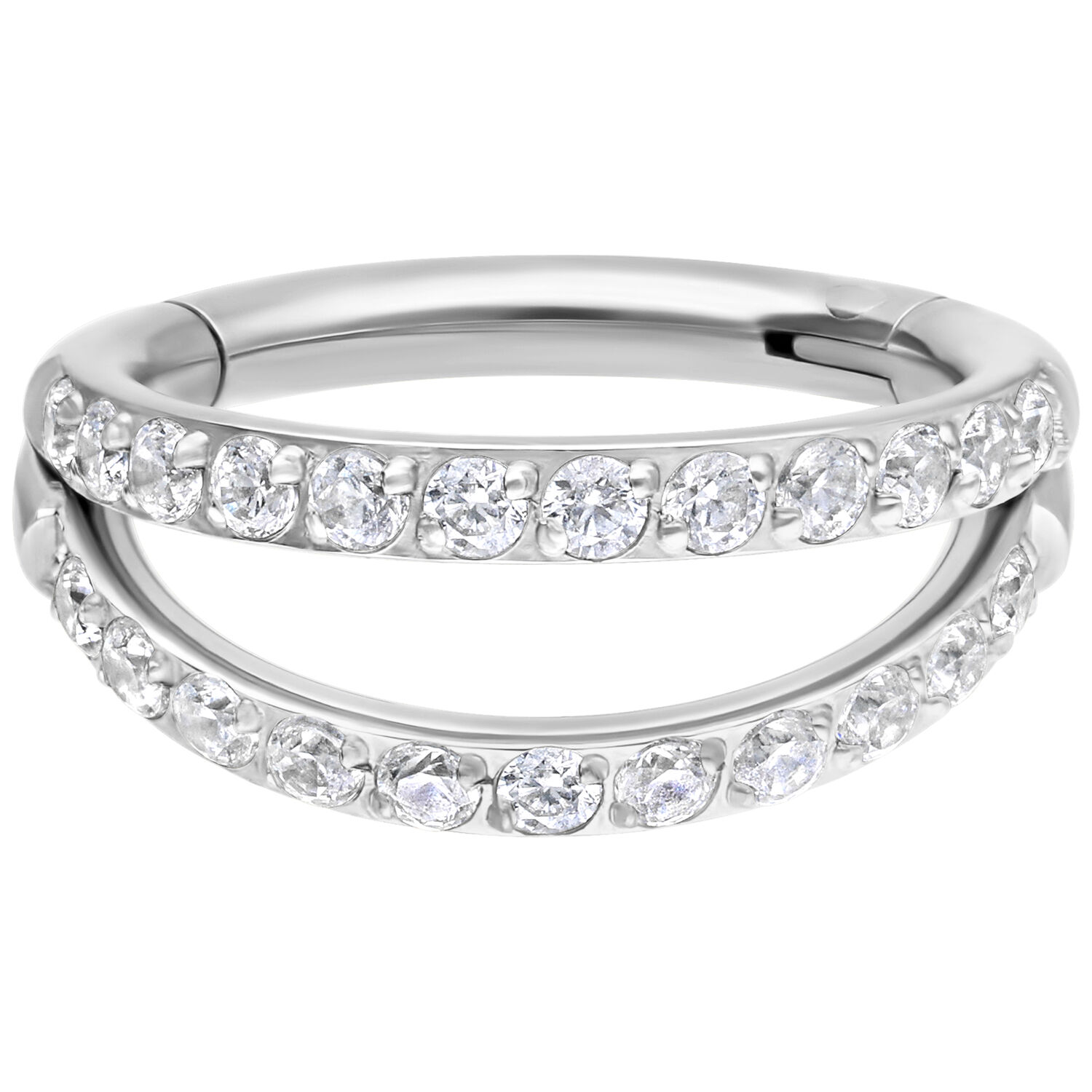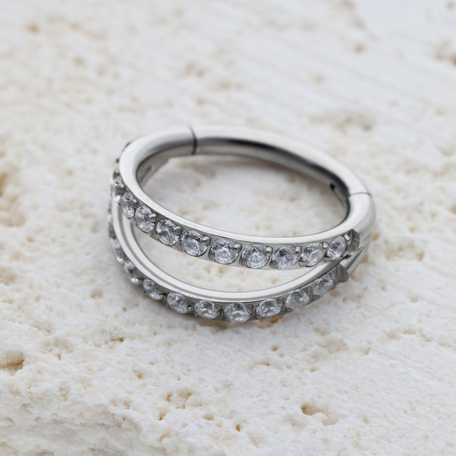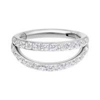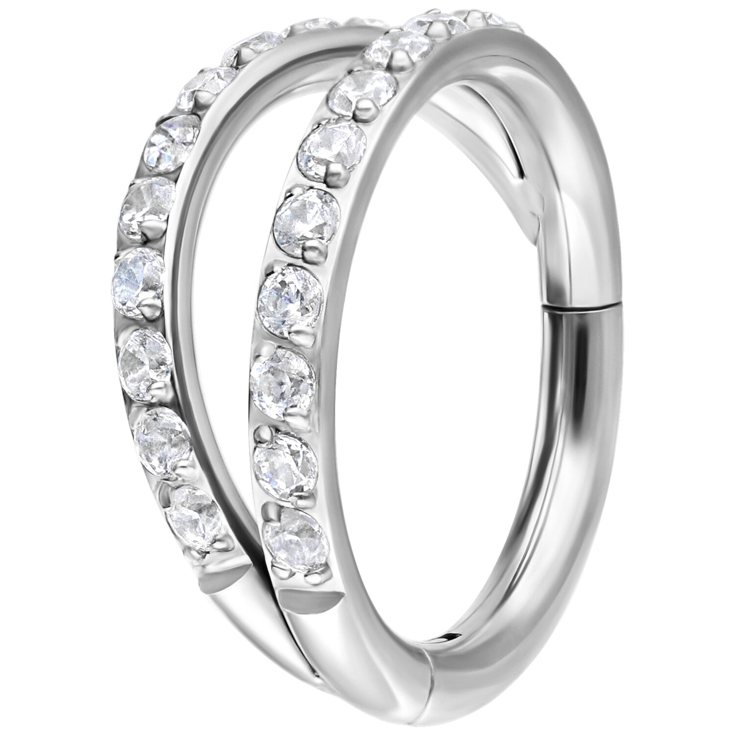 Nuestro Double Row Crystal Clicker de alta calidad destaca por sus numerosos cristales brillantes que lo convierten en un verdadero centro de atención. Deja volar tu creatividad, ya que puedes usar este aro prácticamente en cualquier piercing. Es especialmente adecuado para Nostril, Lobe o Helix. Gracias a su cierre abatible, es súper fácil cambiar tu piercing sin ayuda. ¡Reinvéntate!
