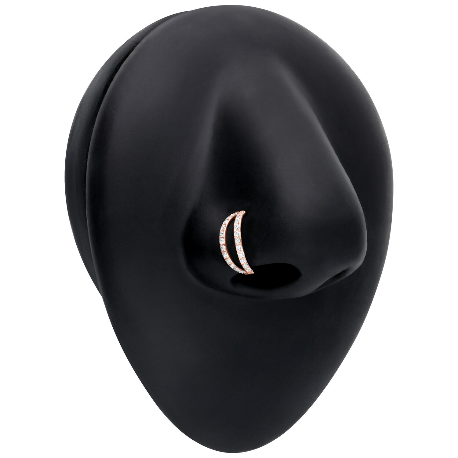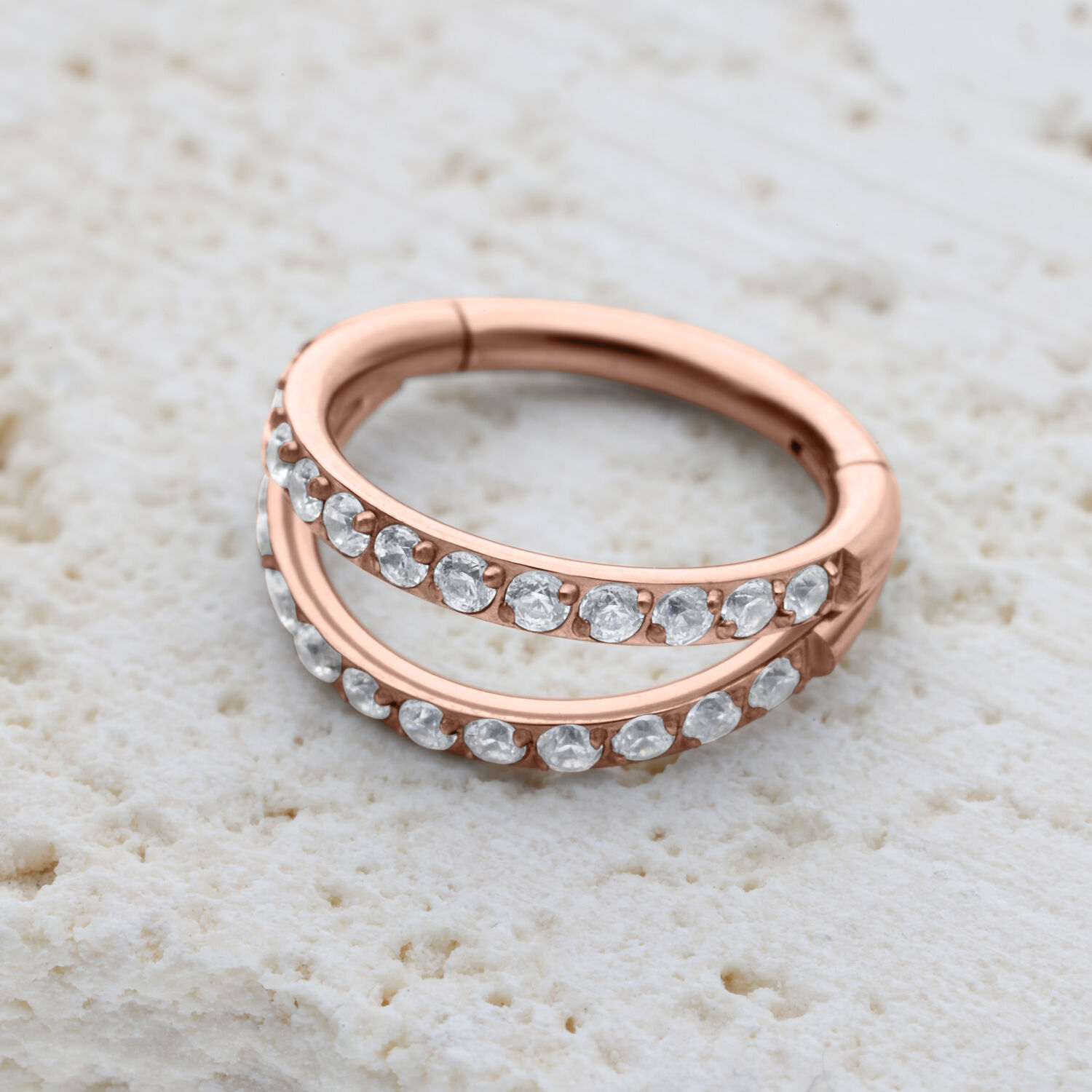 Nuestro Double Row Crystal Clicker de alta calidad destaca por sus numerosos cristales brillantes que lo convierten en un verdadero centro de atención. Deja volar tu creatividad, ya que puedes usar este aro prácticamente en cualquier piercing. Es especialmente adecuado para Nostril, Lobe o Helix. Gracias a su cierre abatible, es súper fácil cambiar tu piercing sin ayuda. ¡Reinvéntate!