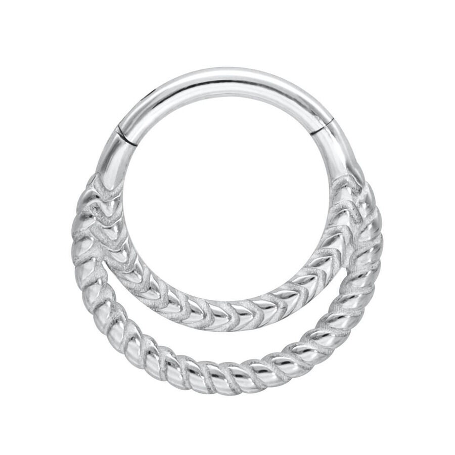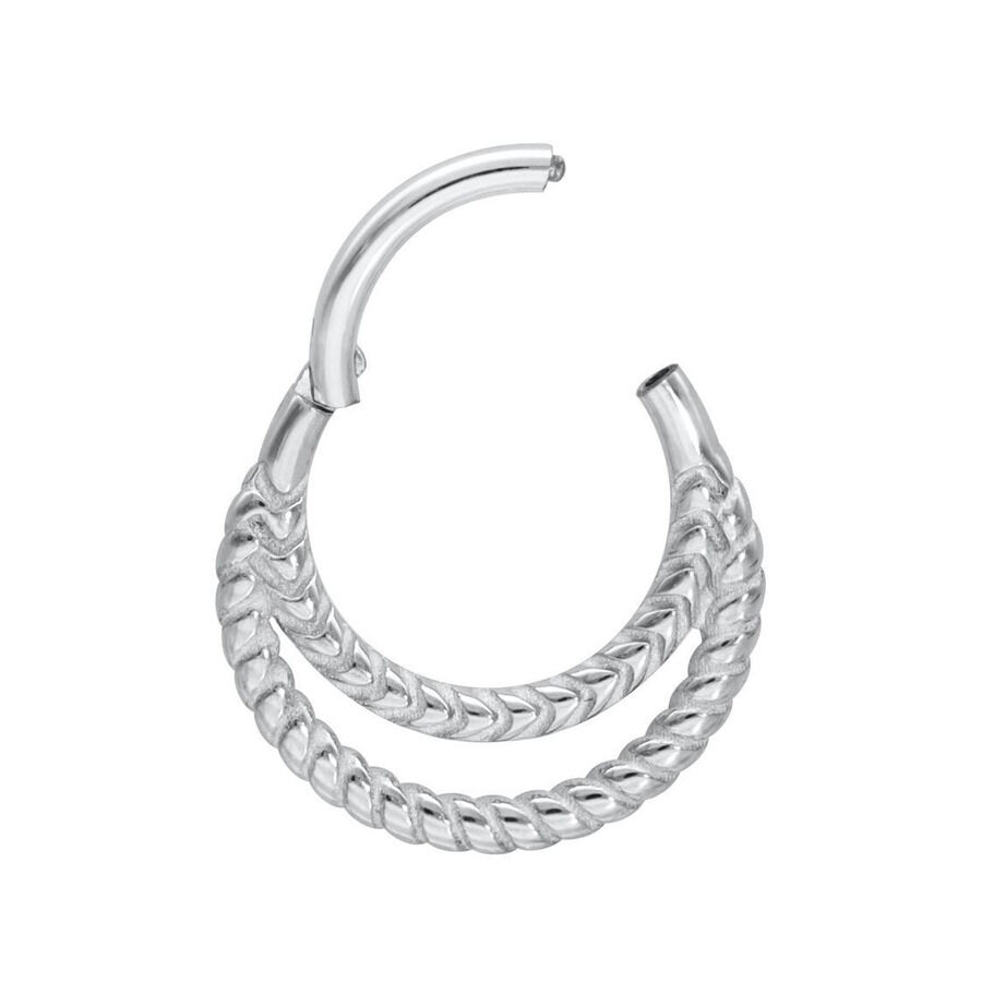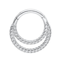 Nuestro Double Twisted Septum Clicker está hecho de acero inoxidable de alta calidad y es ideal para tu Septum. El piercing tiene una barra abatible curva que facilita colocarlo tú mismo, ¡sin necesidad de ayuda!