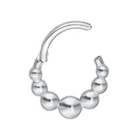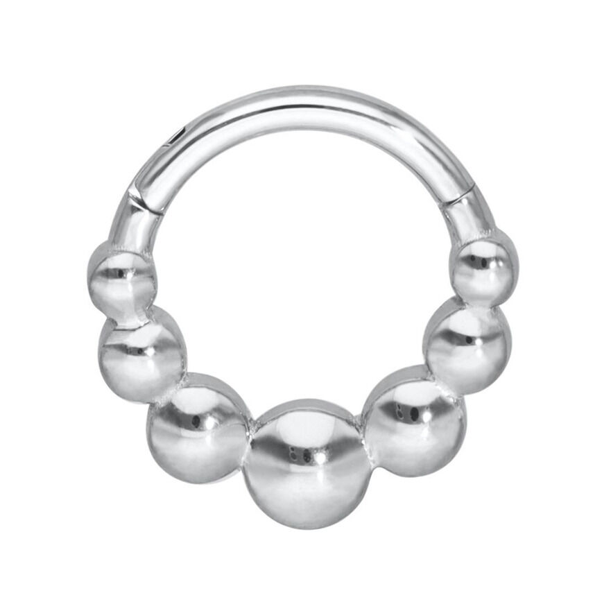 Nuestro Flat Balls Septum Clicker está hecho de acero inoxidable de alta calidad y es ideal para tu Septum. El piercing tiene una barra abatible curva que facilita colocarlo tú mismo, ¡sin necesidad de ayuda!