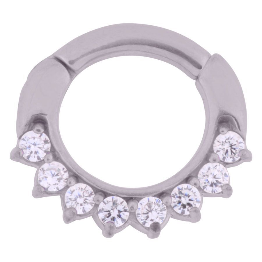 Este glamuroso clicker de alta calidad fabricado en acero inoxidable plateado es especialmente llamativo gracias a sus preciosas piedras, que le harán brillar desde lejos. El anillo de segmento tiene un cierre con bisagra que facilita la inserción del piercing. El piercing es especialmente adecuado para el piercing del tabique, pero también se puede llevar en la oreja o en la banda labial (smiley). Las piedras tienen un tamaño aproximado de 1,2 mm.
